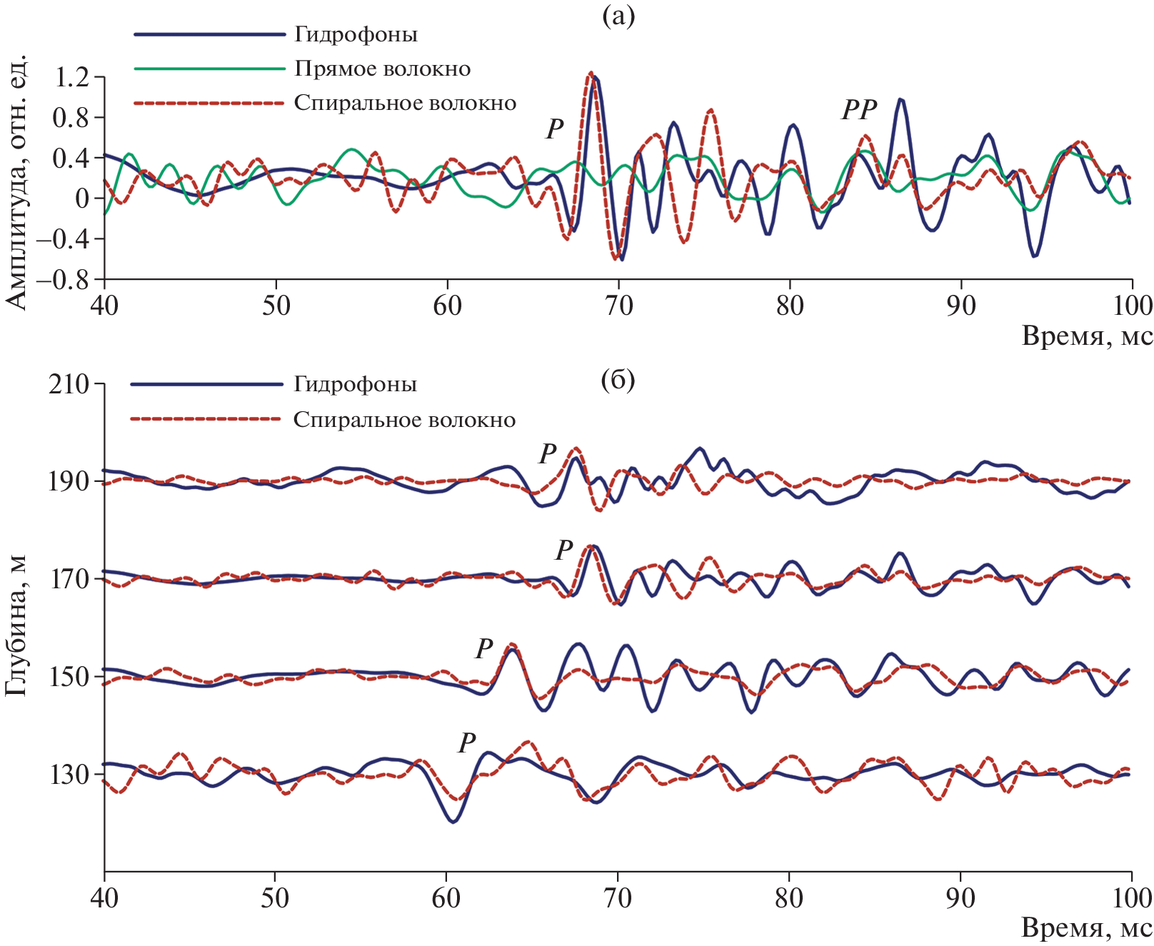 To expand the possibilities of solving geophysical problems using fiber-optic distributed systems for recording acoustic waves, a comparison was made of the signals obtained by traditional hydrophones and a distributed fiber-optic system using a cable containing straight and helical fibers. The studies were carried out by the method of cross-well seismic survey. The possibility of separating direct and refracted head waves recorded by a distributed fiber-optic system and using them to obtain geological and geophysical information about the state of the massif is considered. It is shown that, when using a helically wound fiber, the first arrivals of a direct longitudinal wave can be traced to conduct cross-well seismic of the rock massif and evaluate the velocity distribution by the method of cross-well time-travel tomography on direct waves. For both straight and helical fibers, the stacking of the head waves makes it possible to obtain sufficiently clear arrivals of the head wave even in the dry part of the well and use it to determine the velocities of compressional waves of the near-borehole massif. The composition of the cross-well wave field depends on the radiation patterns of both the source and the receiver of acoustic waves. The use of multiple overlap systems makes it possible to vary the composition of the recorded wave field due to the mutual arrangement of the receiving and exciting lines depending on the tasks being solved.