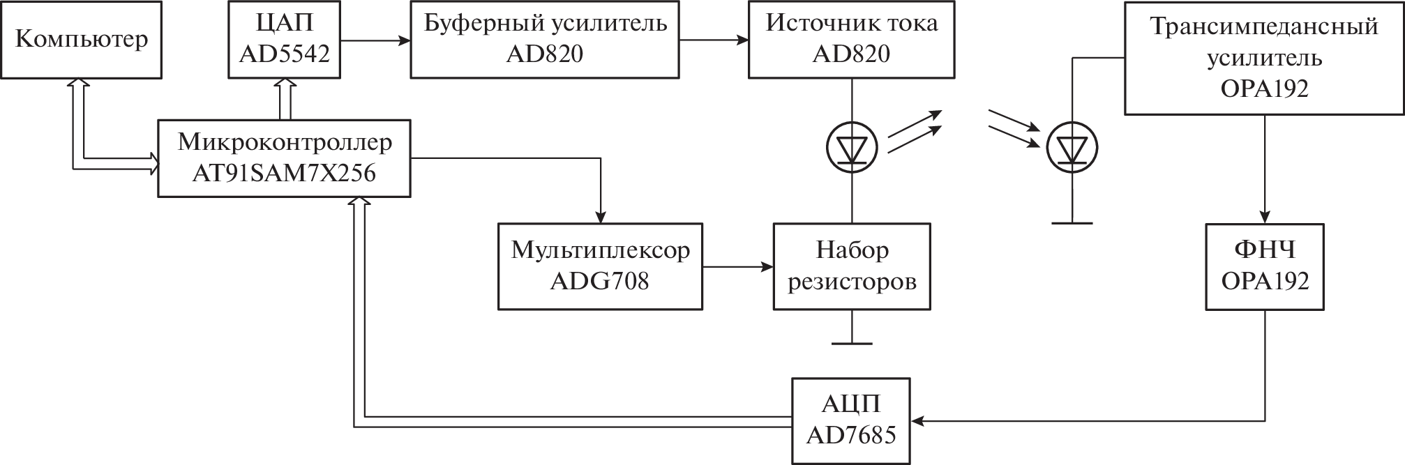 A description and characteristics of the developed internal quantum efficiency (IQE) meter for InGaN LEDs are presented. The meter allows one to determine the IQE of LEDs in the current range up to 25 mA by measuring the watt-ampere characteristic and solving a system of equations relating the values of the radiation power of the LED at two currents with an approximating function obtained on the basis of the ABC model (models of recombination of charge carriers in a light-emitting heterostructure, where A, B, and C are the coefficients of nonradiative, radiative, and Auger recombination, respectively). Unlike the well-known Russian and foreign analogues, the IQE meter is characterized by simplicity of hardware implementation and allows determining the IQE of LEDs at room temperature. The operation of the meter was tested on the example of measuring the IQE of commercial green and blue InGaN LEDs. The meter can be used in scientific laboratories as well as in the input control of enterprises–manufacturers of LED products.