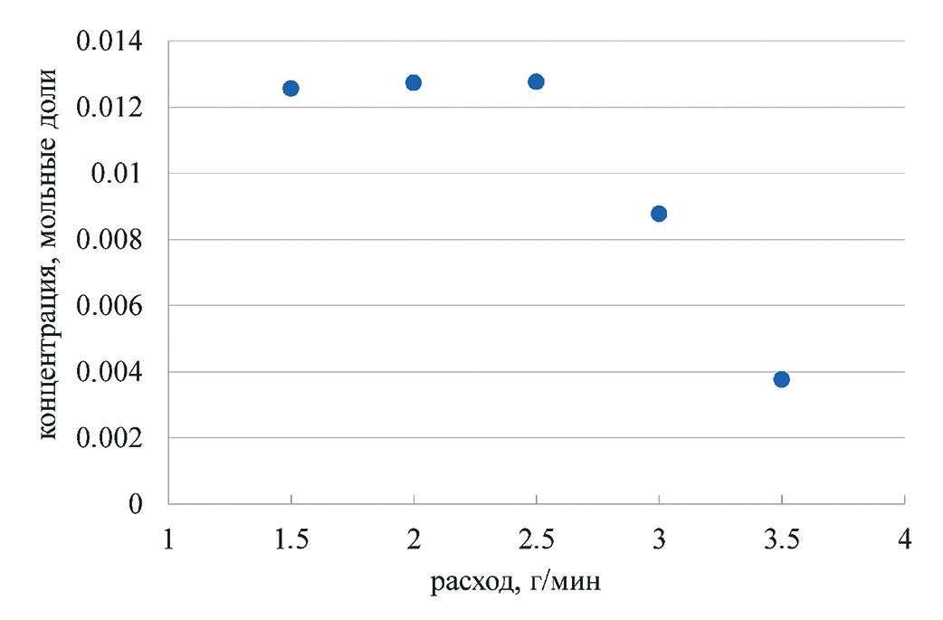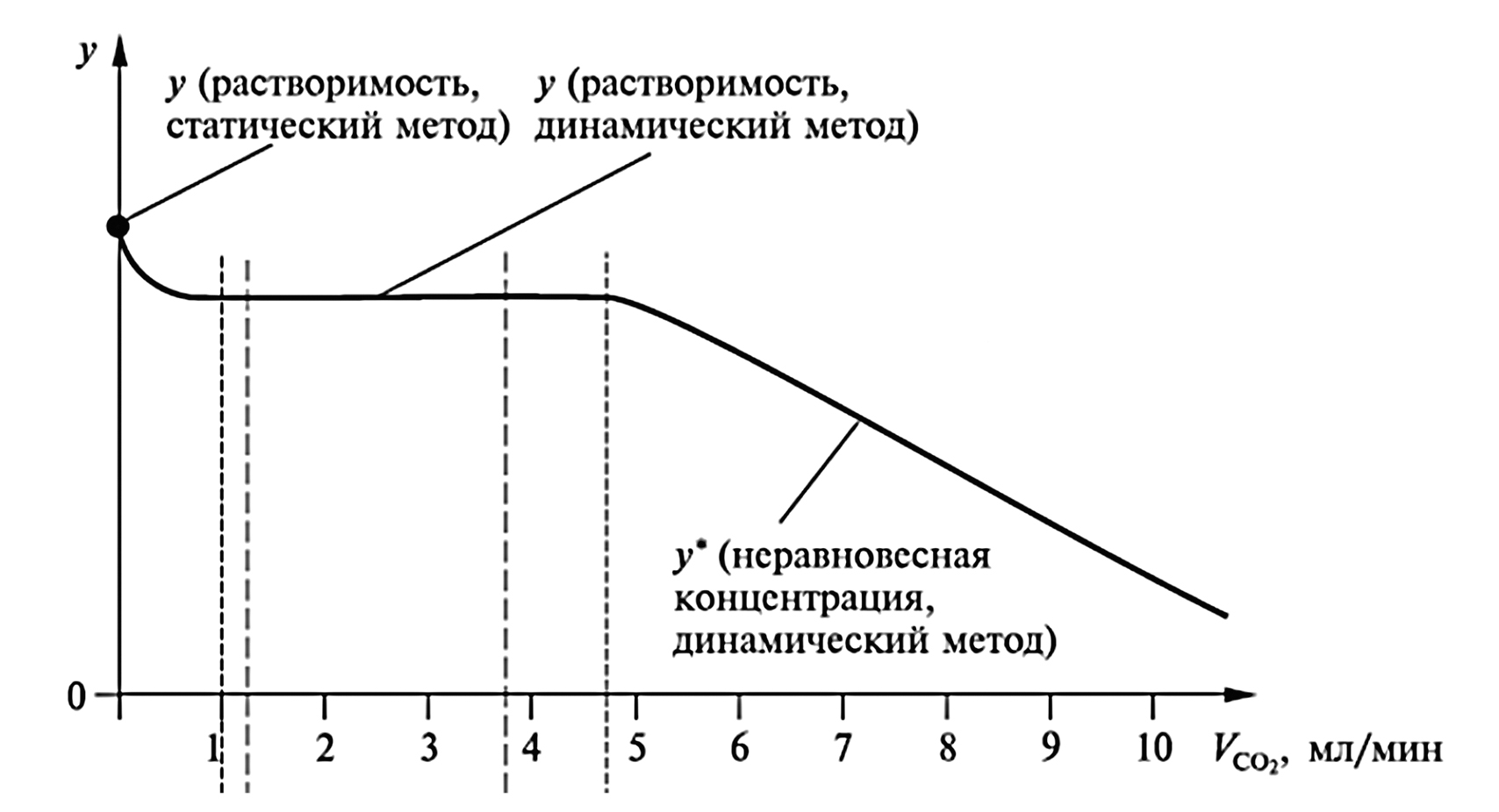 Лишь нулевому значению расхода растворителя отвечает равновесная концентрация целевой компоненты, по определению являющаяся “растворимостью”. Динамический метод реализуется в диапазоне расходов, в котором концентрация оказывается неизменной (плато на рис. 1). Именно эта концентрация в рамках несколько большей погрешности метода и принимается за растворимость.