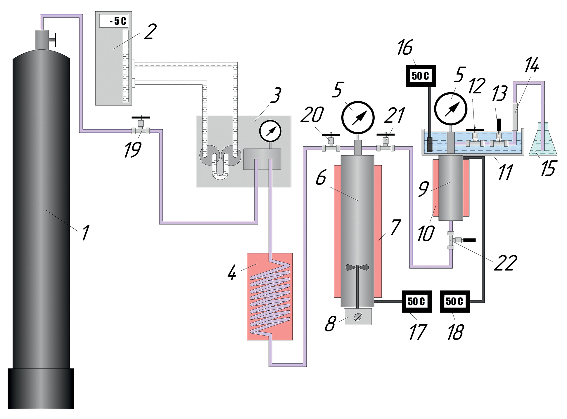 Рис. 2. Схема экспериментальной установки: 1 – баллон с диоксидом углерода, 2 – холодильник с тосолом, 3 – насос Р-50, 4 – теплообменник, 5 – образцовый манометр, 6 – ячейка для диоксида углерода, 7 – обогреватель, 8 – мешалка, 9 – ячейка с измеряемым веществом, 10 – обогреватель, 11 – термостат, 12, 19, 20, 21 – вентиль, 13, 22 – дозирующий вентиль, 14 – пробоотборник, 15 – емкость с водой, 16, 17, 18 – измеритель-регулятор температуры.