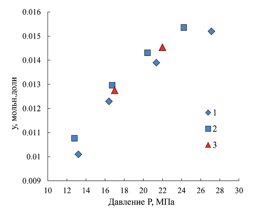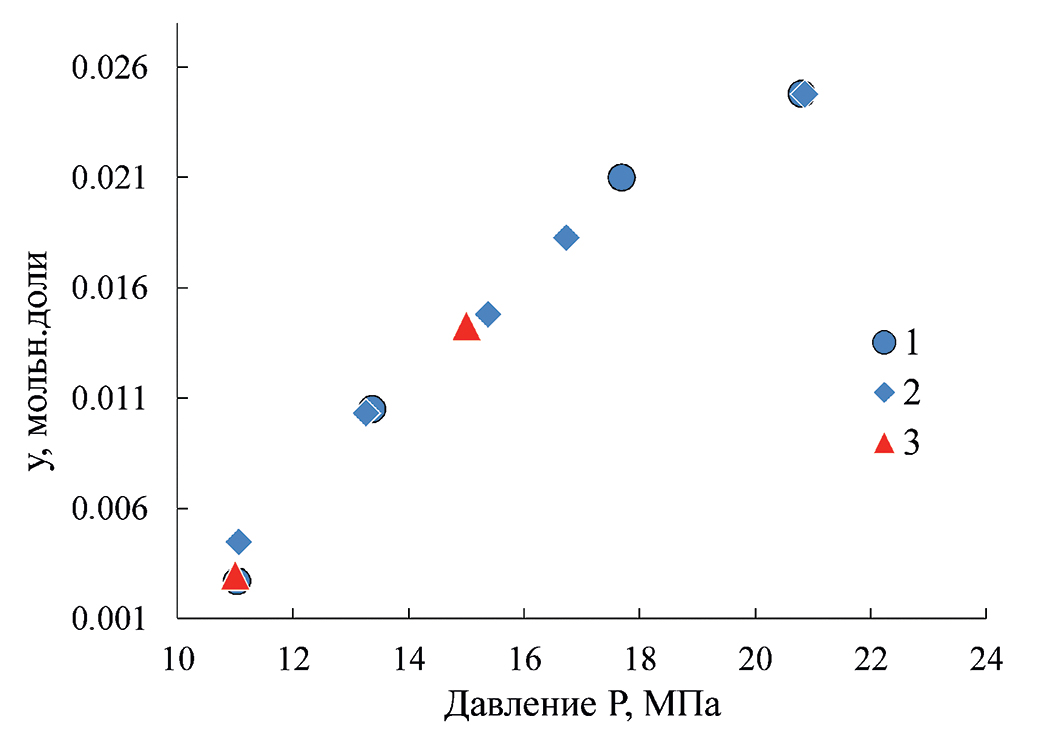 Рис. 4. Растворимость дифенила в сверхкритическом диоксиде углерода при T = 308.15 К: 1 – работа [8], 2 – работа [9], 3 – результаты данной работы.