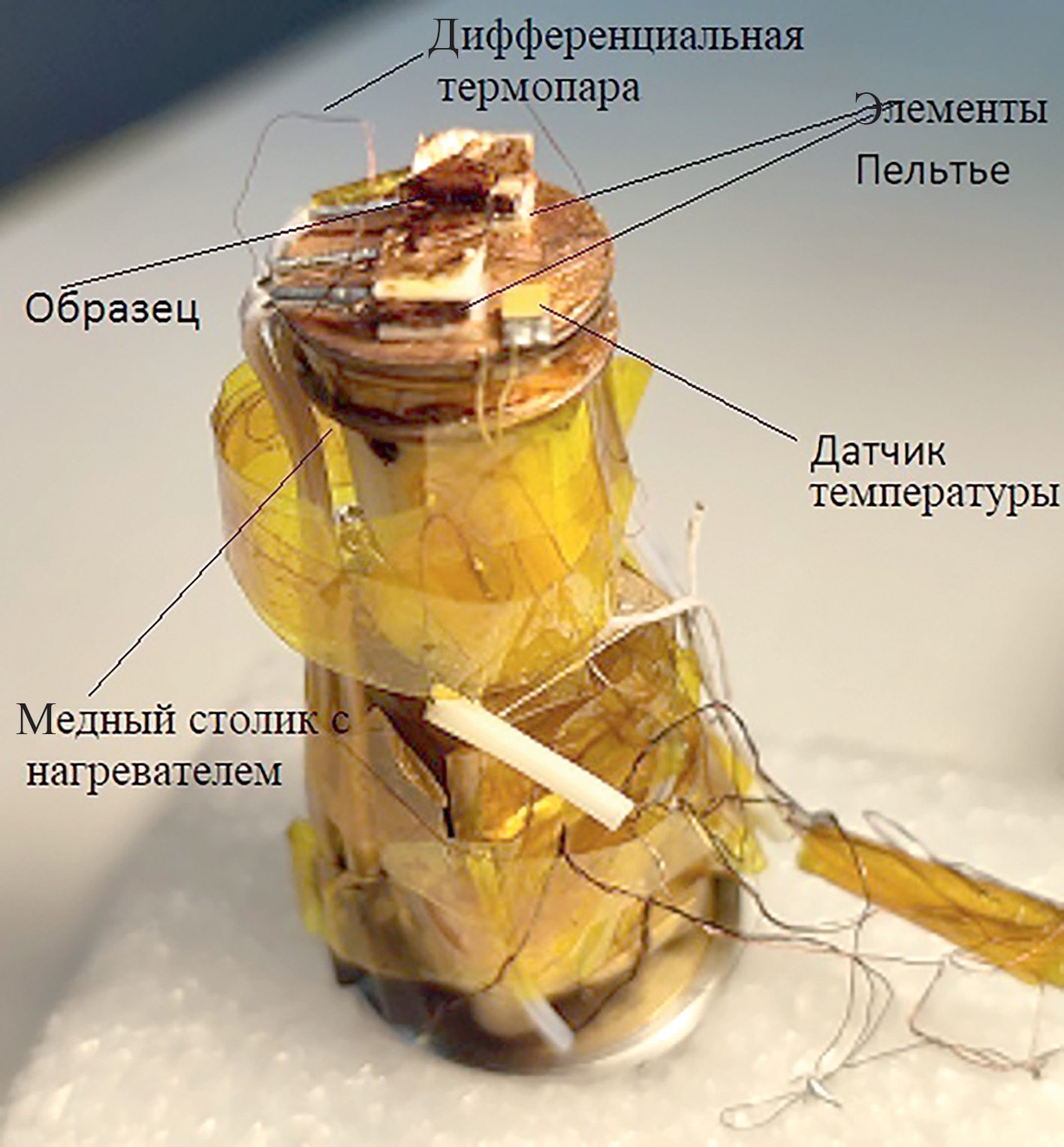 Для создания градиента температуры по плоскости образца использовались два элемента Пельтье, создающих тепловые потоки в противоположных направлениях (рис. 3). Градиент температур измерялся дифференциальной термопарой. Поляризатор и источник света размещались на держателе образца, а анализатор помещался перед объективом микроскопа. Управление микроскопом и камерой осуществлялось через USB-порт.
