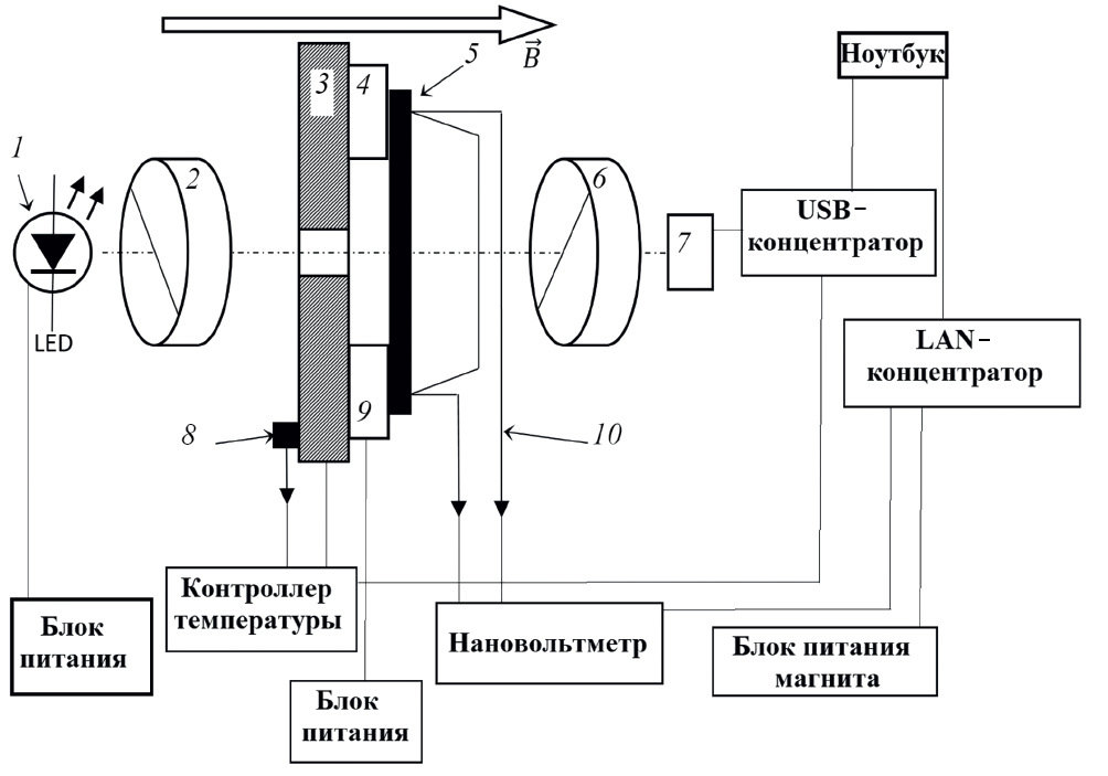 В отсутствие внешнего магнитного поля при температуре ниже точки магнитной компенсации в образце формируется крупноблочная доменная структура. Намагниченность в доменах направлена вдоль нормали к плоскости пленки, а домены различаются направлением намагниченности. Полидоменное состояние образца используется для настройки прибора: поляризатор и анализатор устанавливаются так, чтобы обеспечить максимальный контраст изображения доменной структуры. Общая схема экспериментальной установки представлена на рис. 4.