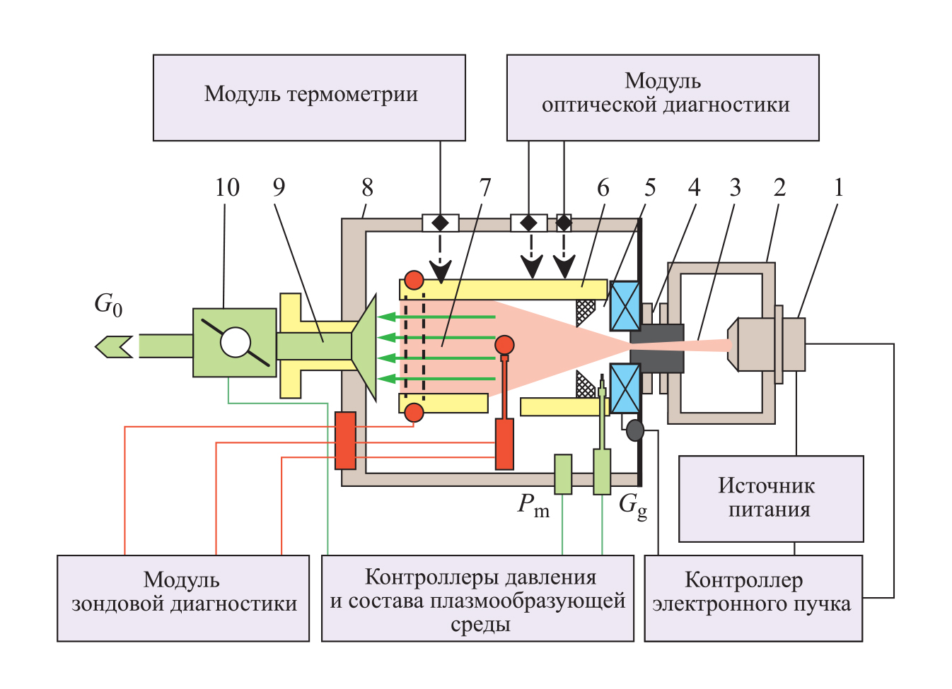 Среди многочисленных способов генерации низкотемпературной плазмы плазма, возбуждаемая инжекцией электронных пучков в плотные газообразные среды (так называемая электронно-пучковая плазма (ЭПП)), занимает особое место благодаря своим уникальным свойствам. Электронный пучок удается инжектировать в плазмообразующие среды практически любого химического состава в широком диапазоне давлений (от долей Торр до атмосферного и даже более высоких давлений). При этом не происходит контракция плазменного объема, характерная для газоразрядной плазмы. В плазмообразующий газ можно вводить мелкодисперсные добавки в виде распыленных порошков или жидкостей, создавая плазму аэрозолей. Как правило, не возникают значимые технические трудности при внесении в ЭПП каких-либо макроскопических тел, например, с целью пучково-плазменной модификации их поверхности.