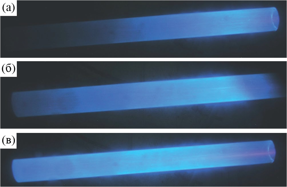 Рис. 3. Генерация ЭПП воздуха в кварцевой трубке диаметром 20 мм: а – Pm = 5.0 Торр; б – Pm = 2.5 Торр; в – Pm = 1.0 Торр.