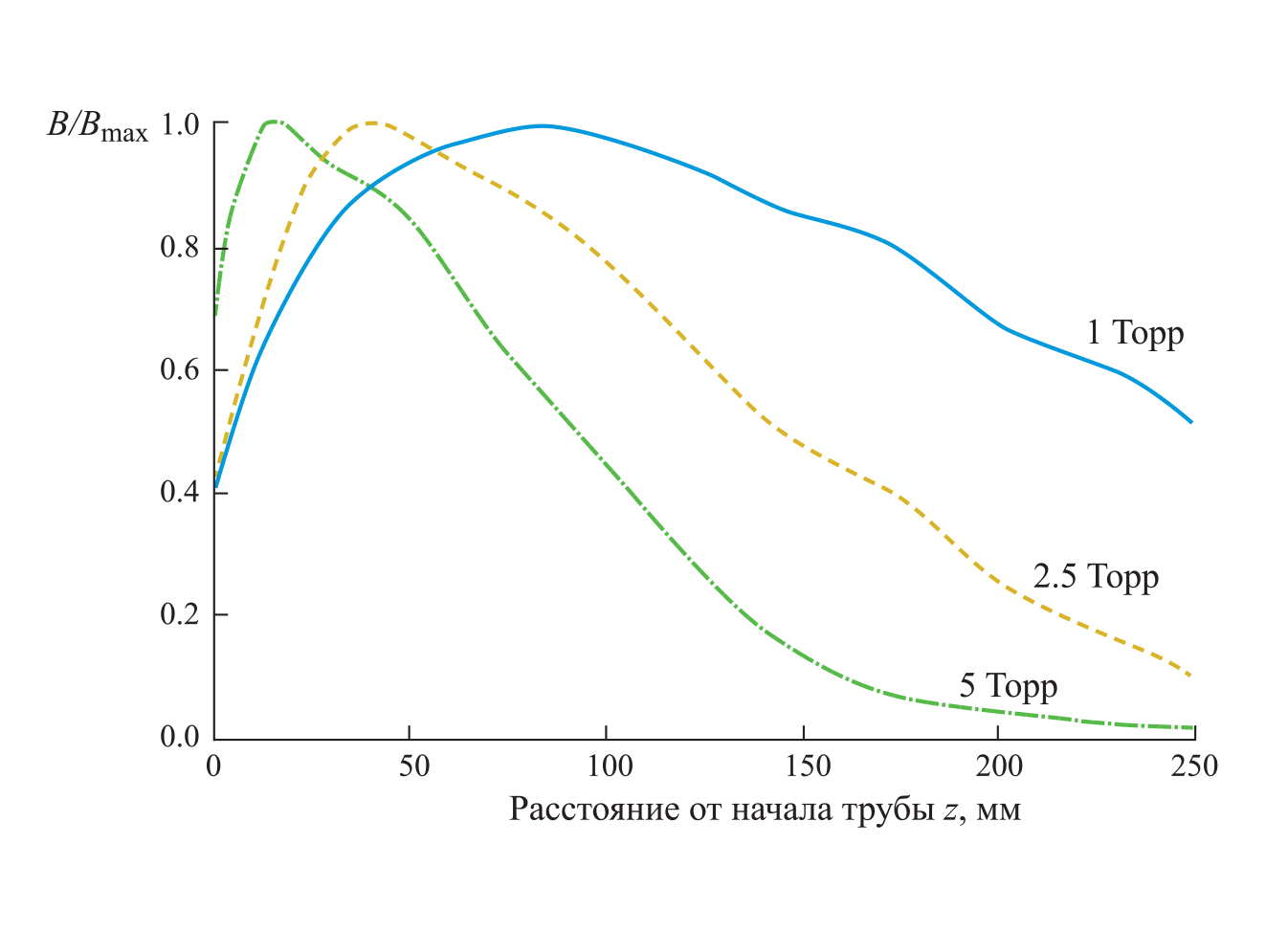Генерация ЭПП внутри прозрачного цилиндрического контейнера иллюстрируется рис. 3. На фотографии хорошо видна зона плазменного облака с максимальной интенсивностью свечения, т.е. зона максимального объемного энерговыделения. Положение этой зоны относительно плоскости инжекции электронного пучка зависит от давления плазмообразующего газа: с ростом давления она смещается в направлении выводного окна, что хорошо видно на графиках, представленных на рис. 4, которые получены в автоматическом режиме при плавном изменении давления Pm в диапазоне 0.5–5.0 Торр. Алгоритм изменения Pm предварительно загружается в контроллер давления плазмообразующей среды (рис. 1). Варьируя с помощью контроллера электронного пучка ускоряющее напряжение электронной пушки и используя плазмообразующие газы с сильно различающейся плотностью (например, гелий и аргон), можно проиллюстрировать ряд важных физических закономерностей, характеризующих движение быстрых электронов в плотной среде [4].