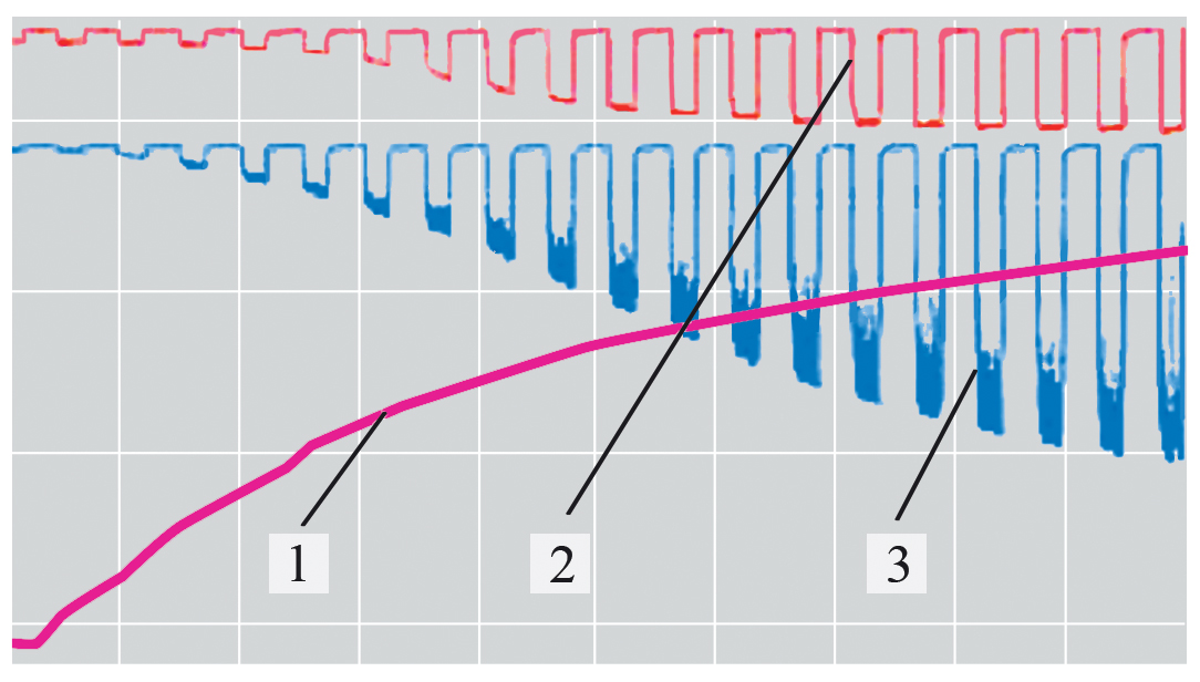 Рис. 6. Экран монитора АЦП при измерении потенциала сферического зонда (3) и кольцевого зонда (2) при генерации ЭПП воздуха в кварцевой трубке при переменном (падающем) давлении плазмообразующего газа (1).