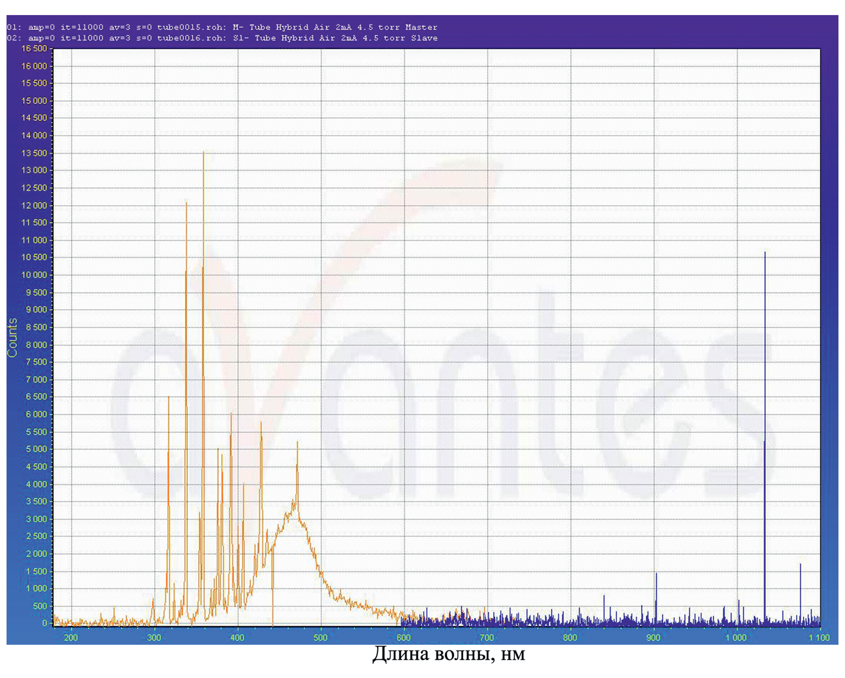 Программное обеспечение модуля оптической диагностики позволяет отфильтровывать информативный сигнал от шума и предварительно идентифицировать спектральные линии. Так, компонентами, которые надежно регистрируются в ультрафиолетовой и видимой частях спектра ЭПП азота, являются молекулы N2 и ионы N2+. Примеры компьютерной обработки спектров ЭПП, возбуждаемой в люминесцирующем контейнере, можно найти в нашей работе [5]. Таким образом, в ходе экспериментов с ЭПП удается не только продемонстрировать факт генерации оптического излучения с линейчатым и непрерывным спектрами, но и объяснить, каким образом можно идентифицировать излучения, присущие различным процессам, которые происходят в рабочем объеме установки.