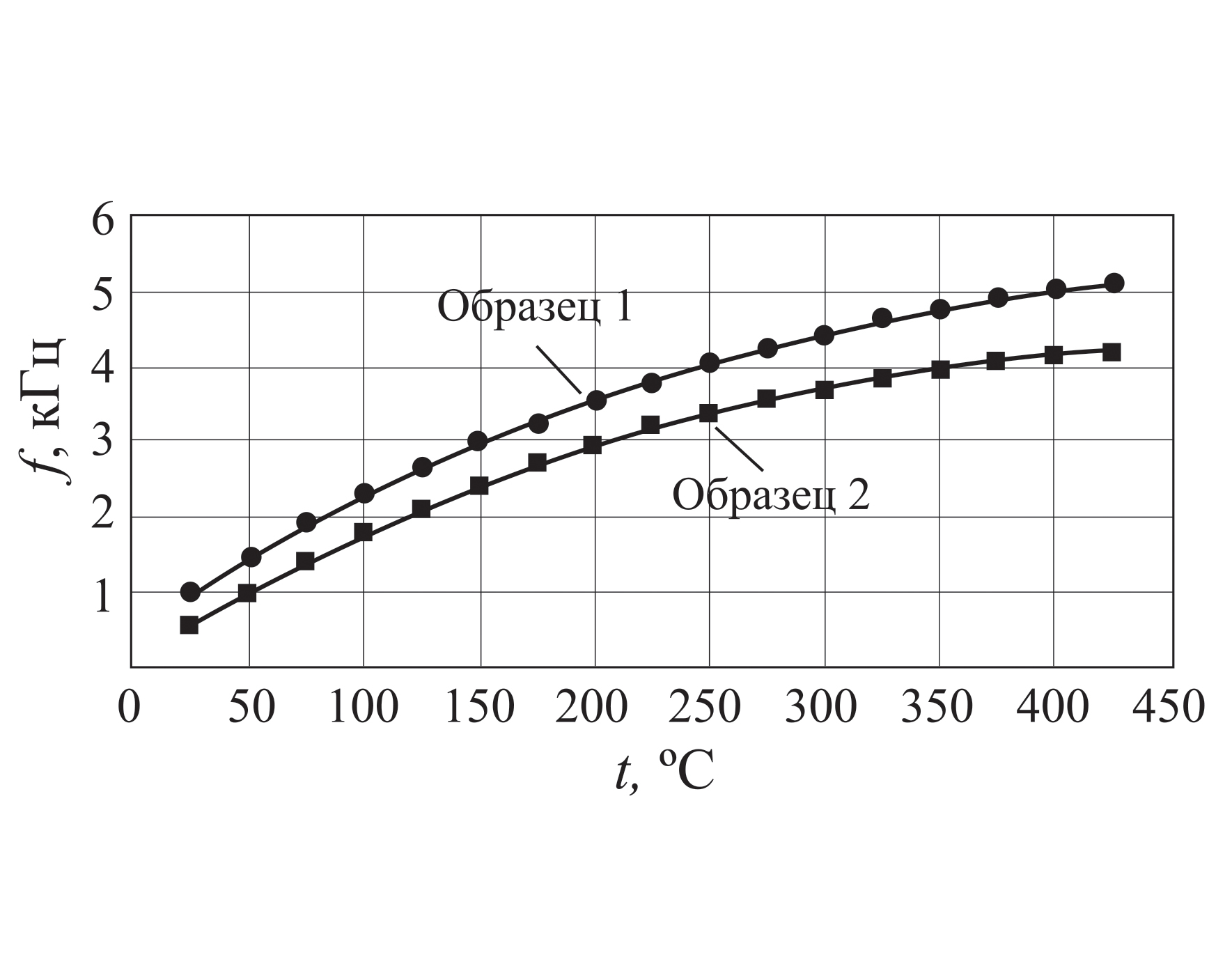 Рис. 3. Зависимости частоты от температуры для двух образцов СА-термодатчиков, измеренные с применением модуля ПНЧ.