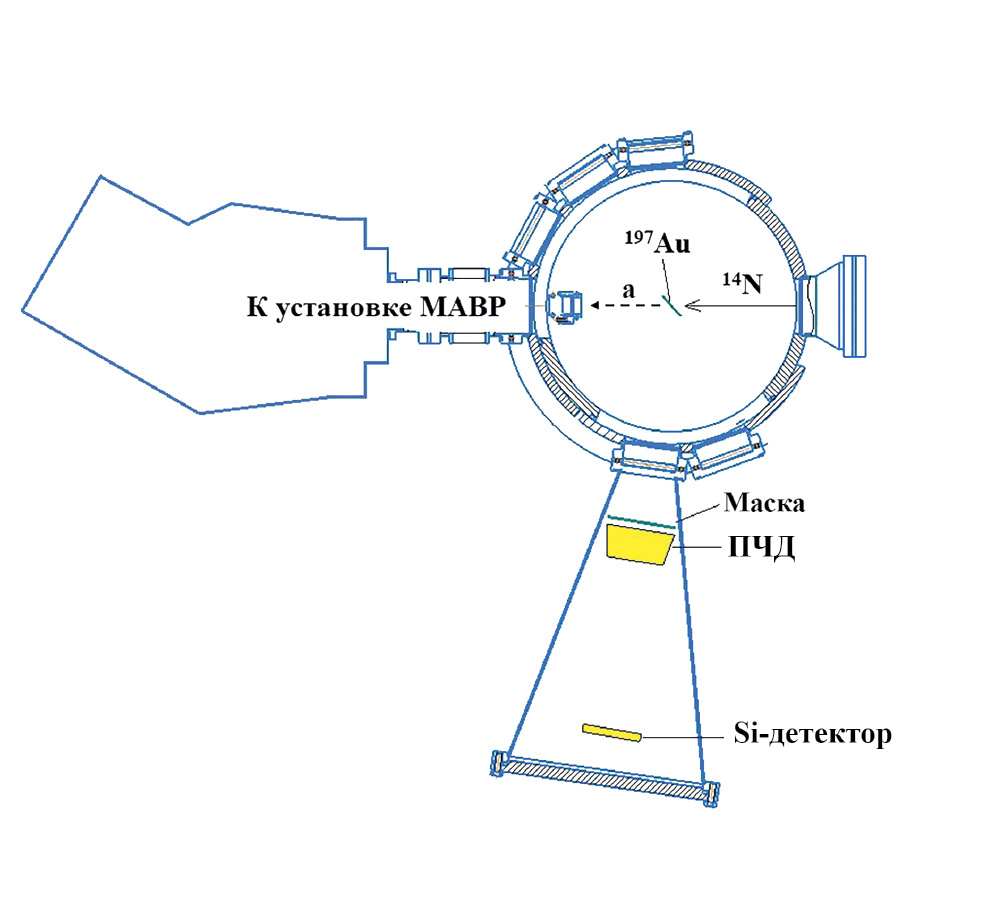 Эксперимент проводился на пучках ионов 14N с энергией 120 МэВ на циклотроне У-400 ЛЯР, ОИЯИ. Интенсивность пучка 14N составляла 30 нА. Пучок выводился на мишень 197Au толщиной d = 2 мкм под углом 45°. Времяпролетный спектрометр был расположен под углом 85° к реакционной камере и состоял из стартового ПЧД на основе микроканальных пластин размером 40×60 мм2, маски, закрепленной перед ПЧД для определения координат регистрируемых частиц, и стопового Si-детектора размером 50×50 мм2. Расстояние от мишени до МКП – 310 мм, пролетная база между МКП-детектором и Si-детектором – 230 мм. Телесный угол составил 27 мср.