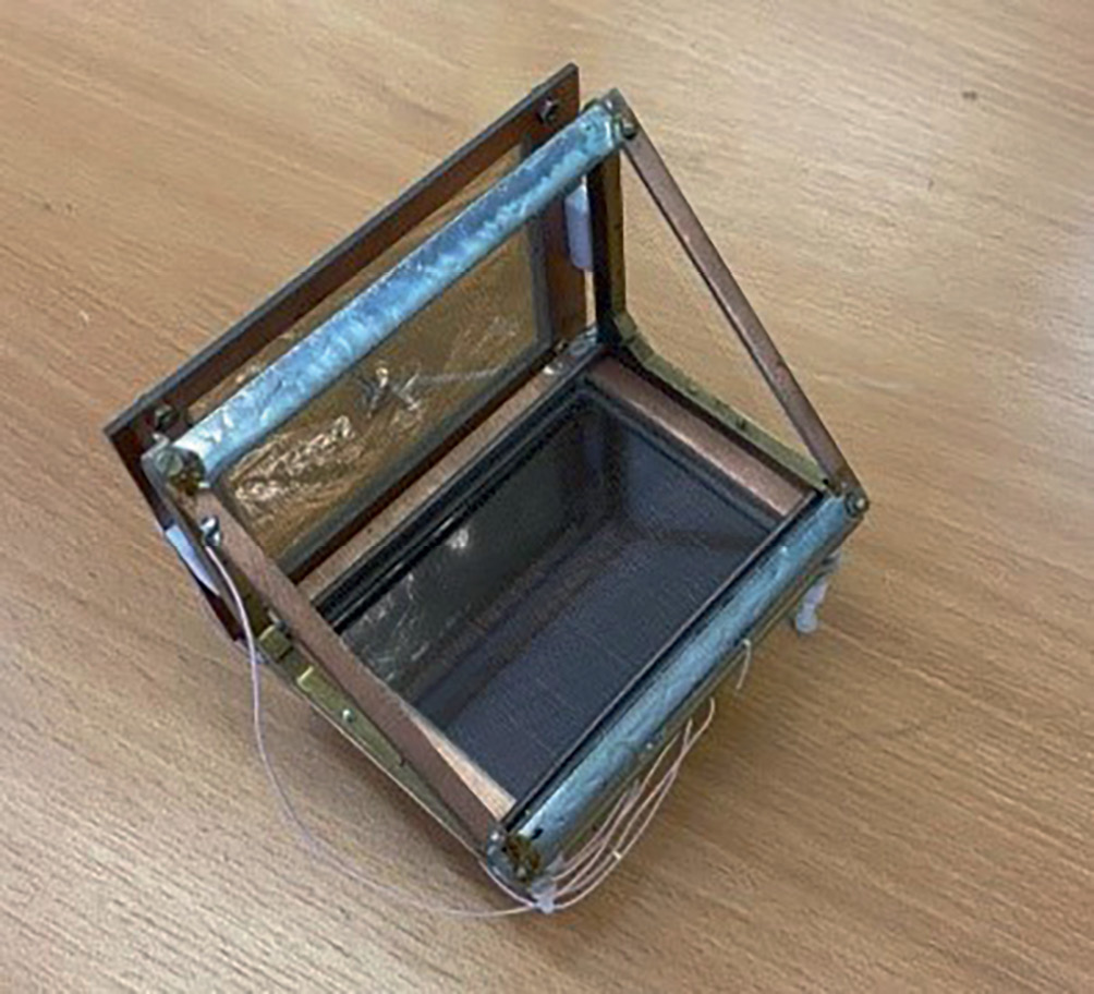 Для достижения высокого позиционного разрешения в данной работе был выбран позиционно-чувствительный детектор на основе микроканальных пластин (МКП). Детектор состоит из лавсановой фольги размером 70×50 мм2 и толщиной 140 мкг/см2 с золотым напылением, толщиной 20 мкг/см2, ускоряющей сетки, электростатического зеркала (медно-бериллиевая проволока диаметром 50 мкм), шевронной сборки двух МКП размером 60×40 мм2 толщиной 1 мм, координатной системы из двух ортогональных линий задержки. Каждая линия задержки имеет змеевидную форму и изготовлена из медно-бериллиевого провода диаметром 100 мкм. Линии задержки намотаны на капролоновые винты с шагом 0.5 мм, укрепленные на стальной отражающей плате. Диаметр винтов для линии задержки y-координаты 3 мм, а x-координаты – 5 мм.