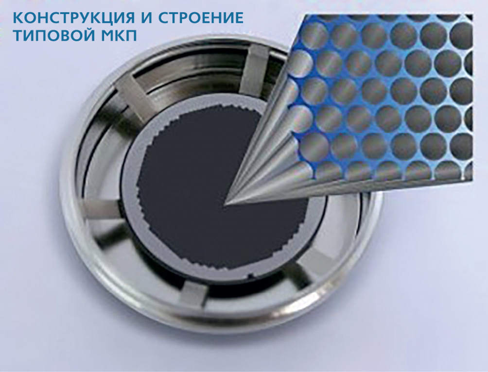 Пластины изготавливаются из свинцового стекла толщиной 0.5–1 мм и представляют собой порядка 106 электронных умножителей: стеклянные каналы диаметром около 10 мкм, упорядоченные в сотовые структуры (рис. 4). Электроны, попадая внутрь каналов с сопротивлением до 106 Ом, выбивают с их поверхности вторичные электроны. Многократное повторение этого процесса приводит к возникновению электронной лавины на выходе из канала с усилением сигнала примерно в 107 [9].