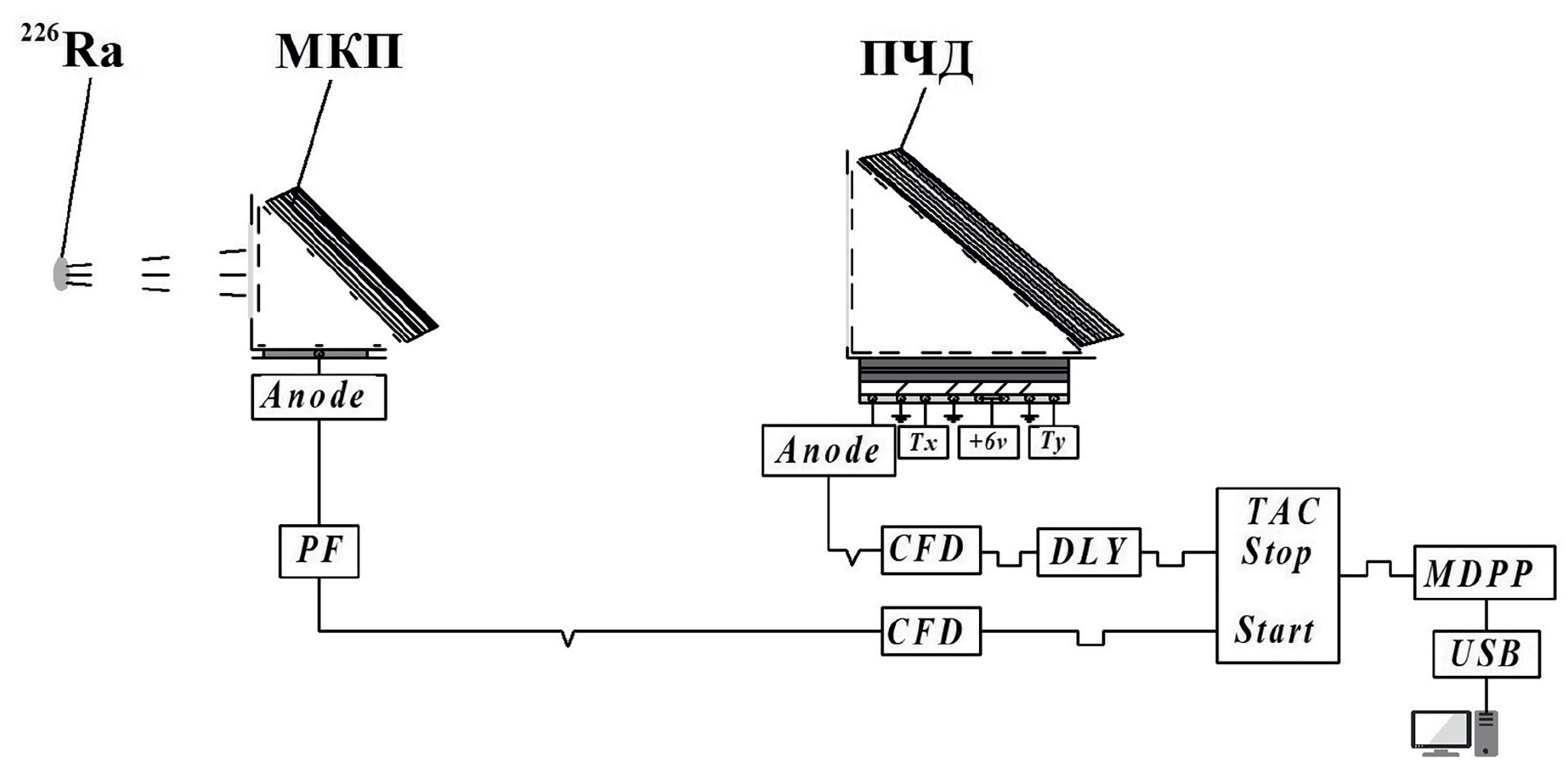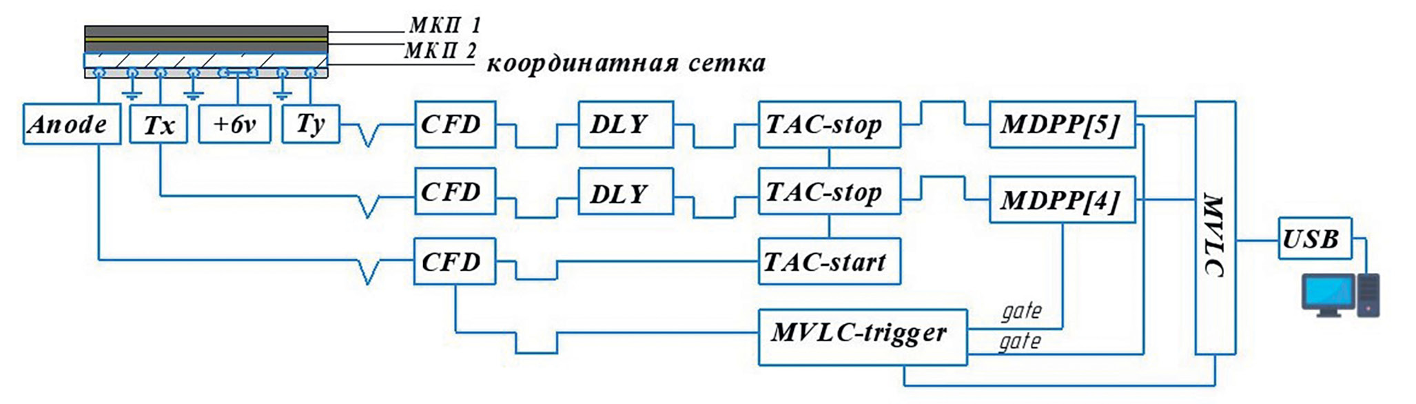 Сигналы с анода и координатные сигналы подаются на дискриминаторы (CFD) со следящим порогом (рис. 6). Далее выходной логический сигнал с дискриминатора (анода) идет на “старт” ТАС (время-амплитудный преобразователь), а координатные сигналы X, Y задерживаются таким образом, чтобы они приходили на схему совпадений всегда позже стартовых сигналов и подаются на “стоп” (TAC). Далее сигнал поступает на импульсно-цифровой преобразователь (MDPP-16). Данные, полученные со всех модулей, передаются в крейт-контроллер (MVLC) и накапливаются в системе набора данных (DAQ) с помощью высокоскоростного USB3.0 интерфейса. Запуск системы набора осуществляется с логического сигнала анода МКП-детектора (MVLC-trigger). Затем в программе набираются спектры событий, которые сохраняются в виде бинарных файлов. Файлы конвертируются в ROOT-формат для дальнейшего анализа.