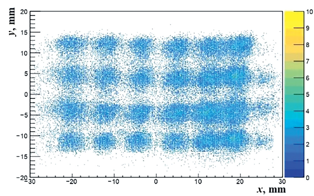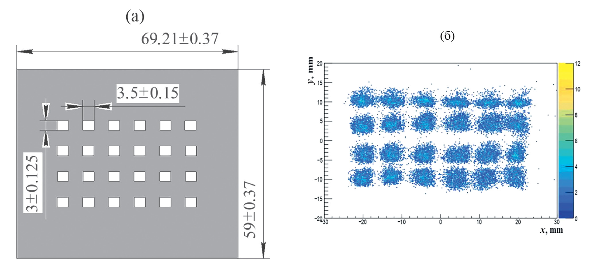 Для измерения координат регистрируемых частиц были проведены измерения осколков спонтанного деления 252Cf. Перед ПЧД была закреплена маска размером 69 × 59 мм2, толщиной 1 мм с 24 отверстиями: по 6 отверстий по оси X шириной 3 мм, по 4 отверстия по оси Y шириной 3.5 мм. Шаг между отверстиями составил 5 мм. Источник был установлен перед ПЧД с маской таким образом, чтобы излучение попадало на всю поверхность маски, установленной перед входным окном детектора. Расстояние между маской и источником излучения составило 20 см, а между маской и входным окном – 1 см.