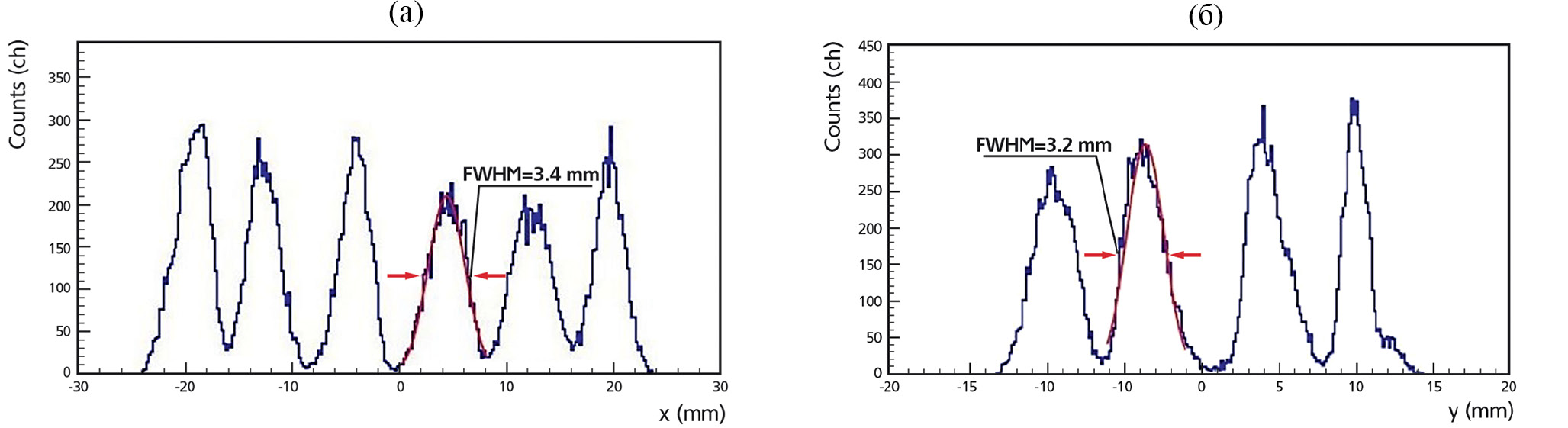 Для координаты X было измерено FWHM = 3.4 мм, для координаты Y – FWHM = 3.2 мм. При тестировании детектора источником 252Cf были получены координатные разрешения: для координаты Х – 1.4 мм для координаты Y – 1.1 мм и построены координатные спектры (рис. 8).