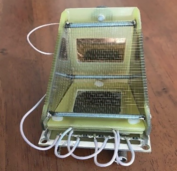 Стартовый МКП-детектор [10] состоит из конверсионной фольги размером 25×35 мм2, ускоряющей сетки, электростатического зеркала, сборки микроканальных пластин диаметром 32 мм (рис. 10).