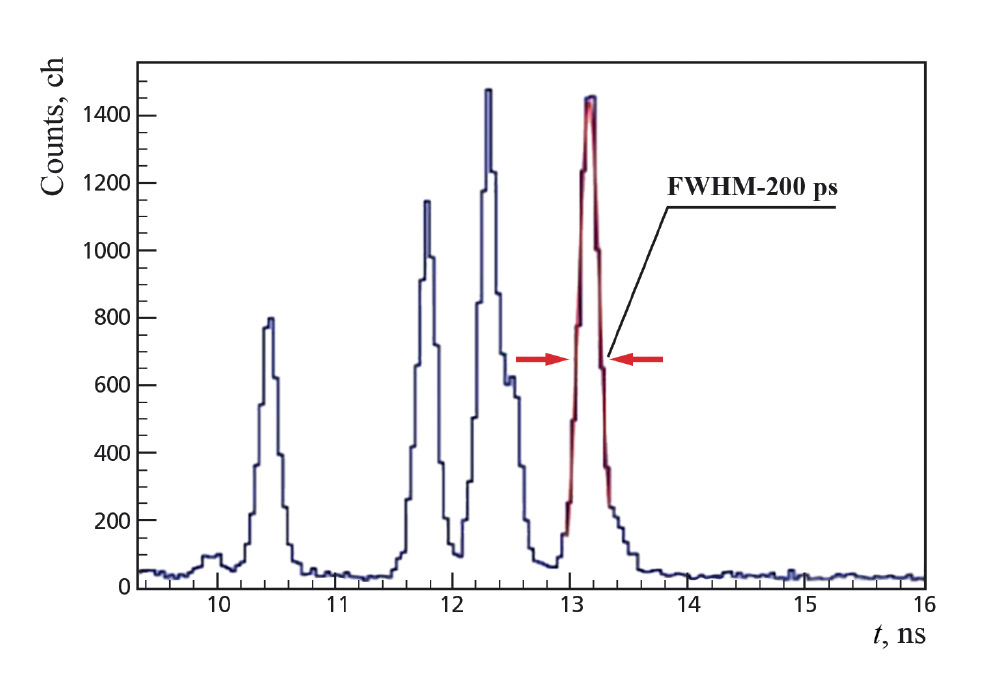 В результате измерений времени пролета альфа-частиц было получено хорошее временное разрешение 200 пс, представленное на рис. 11.