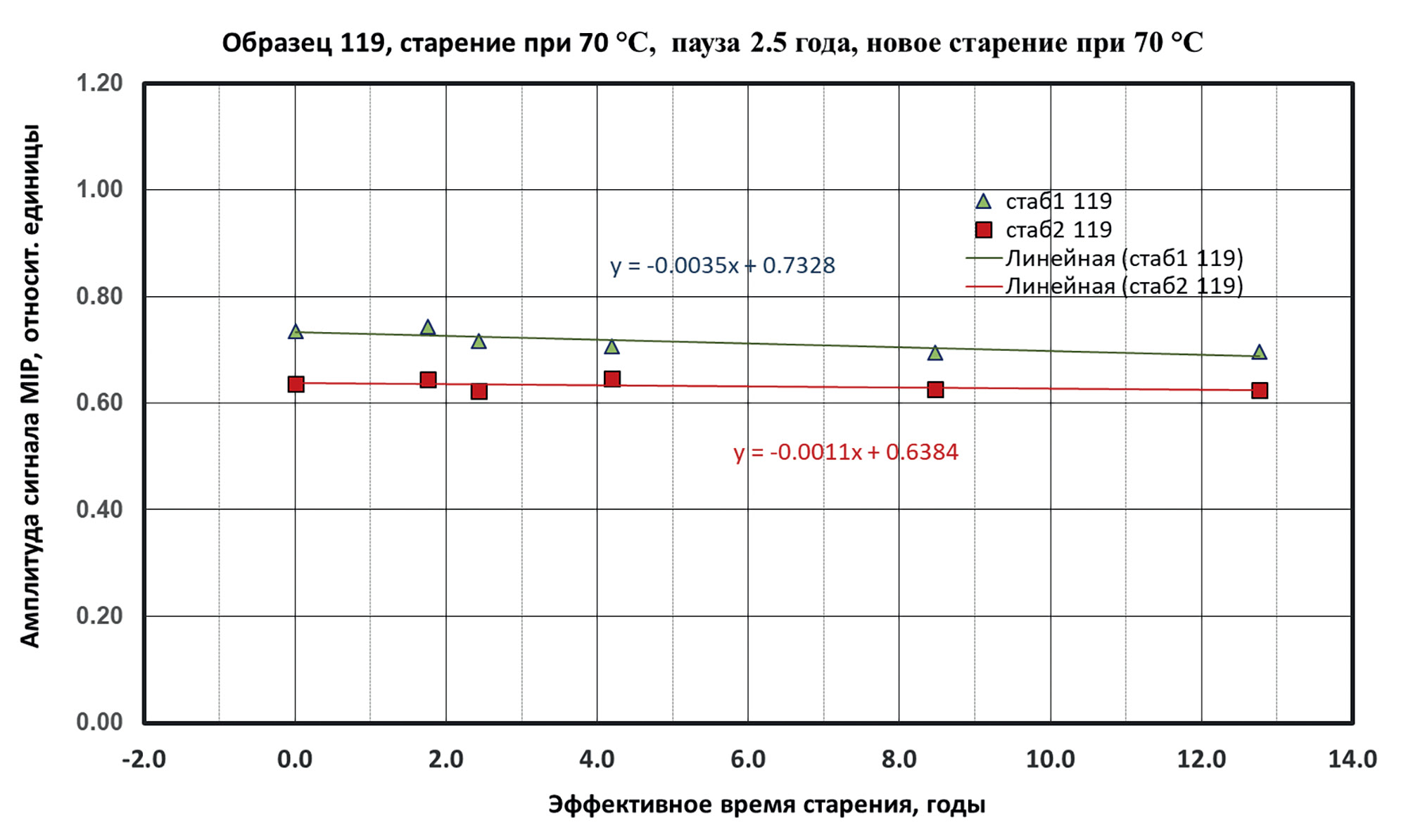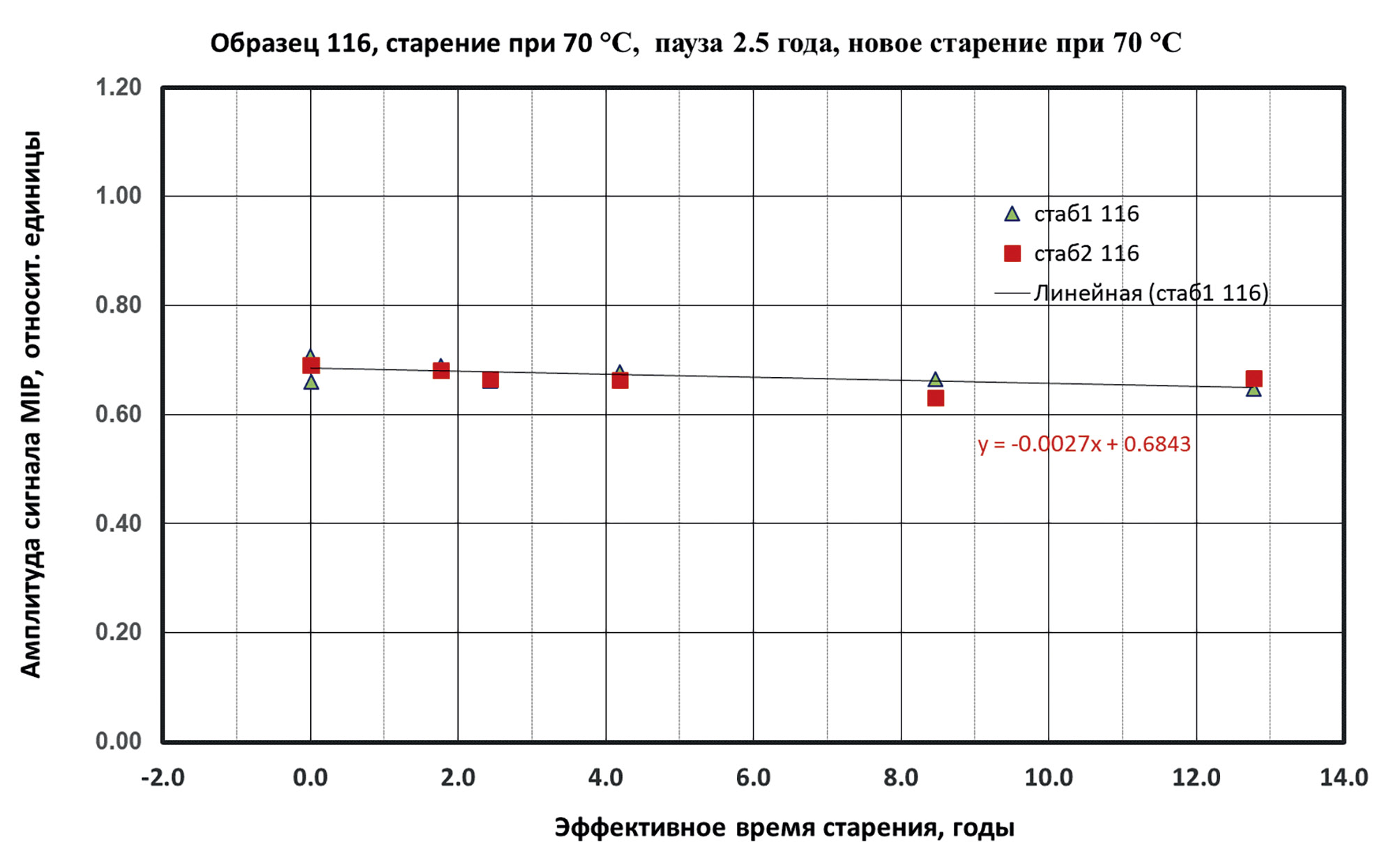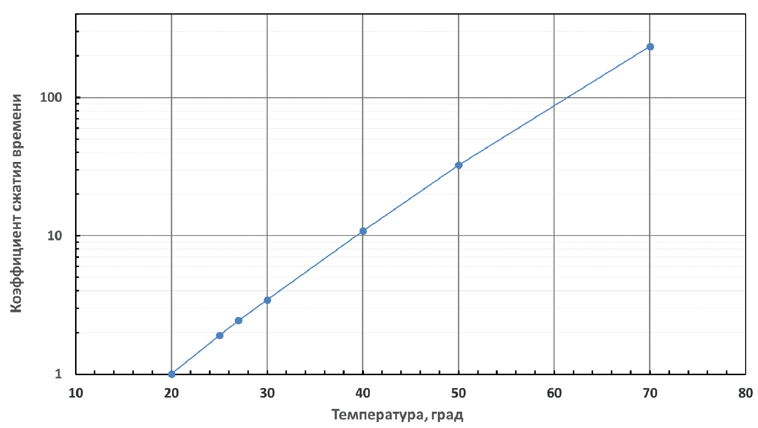 Результаты старения при температурах 50 ˚C и 70 ˚C в шкале времени, пересчитанной по формуле зависимости скорости химической реакции от температуры, хорошо согласуются и ложатся на общую кривую. Измерение старения при двух разных температурах равнозначно новому измерению энергии активации, а при использовании известной из литературы величины энергии активации позволяет делать перекрестную проверку результатов.