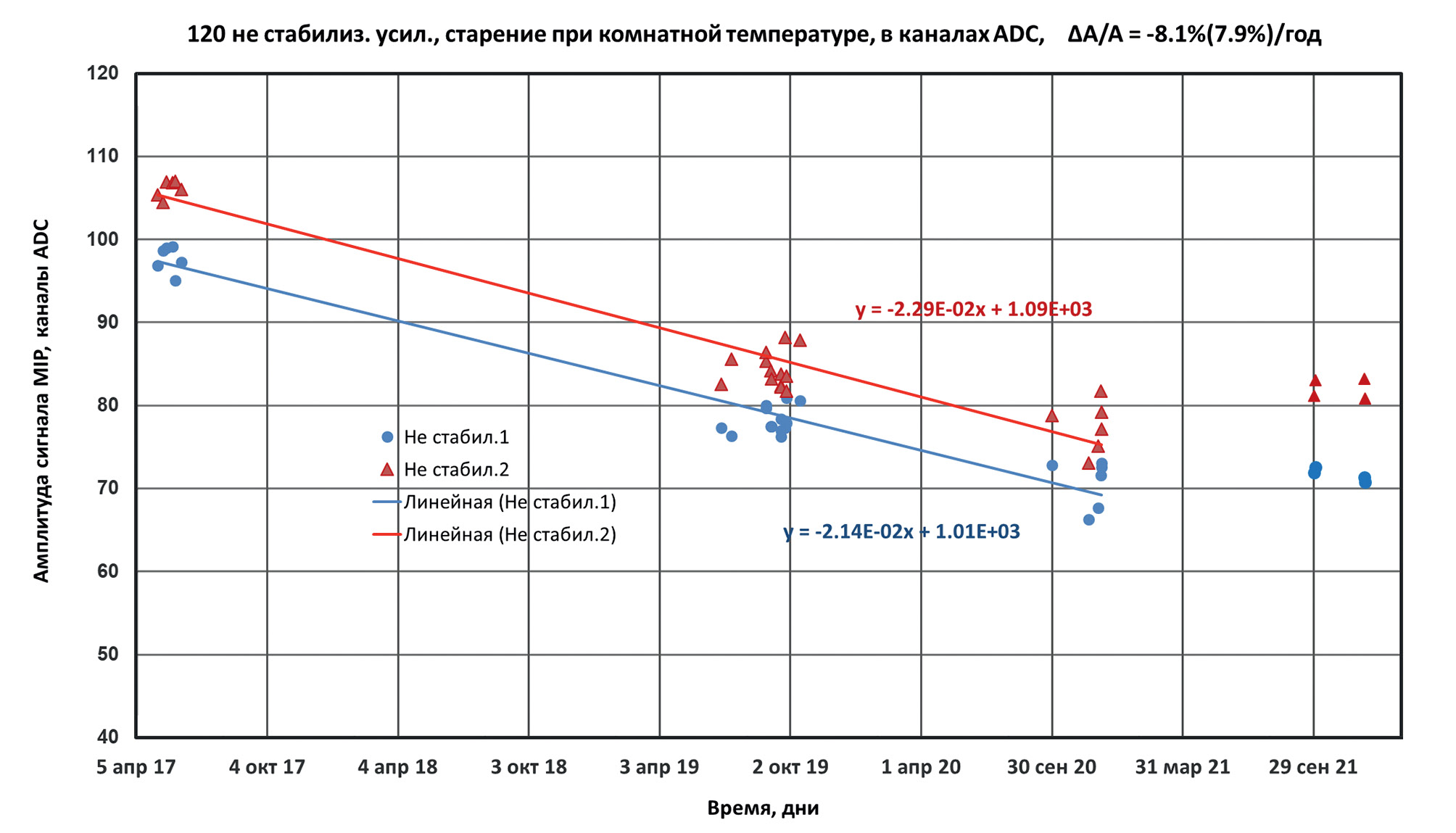 Два прототипа, каждый из которых содержит два изолированных друг от друга по сбору света полос сцинтиллятора, были в 2017 году подвергнуты ускоренному старению с выдержкой в течение 53 дней в термостате при температуре 70 ˚C, что было эквивалентно старению в течение 30 лет при температуре 20 ˚C (рис. 3). Сигнал сцинтиллятора за это время уменьшился до уровня около 70% от первоначального уровня и далее практически не изменялся в течение 2.5 лет. После этого, в конце 2019 года, эти же образцы были подвергнуты новому сеансу ускоренного старения выдержкой в термостате при температуре 70 ˚C с перерывами для измерений, в течение 20 дней, что было эквивалентно старению в течение 13 лет при температуре 20 ˚C. Результаты измерений всех 4 счетчиков показали стабильные амплитуды сигналов от мюонов, старение сцинтиллятора не превышало 0.5% в год при температуре 20 ˚C (рис. 5, 6).