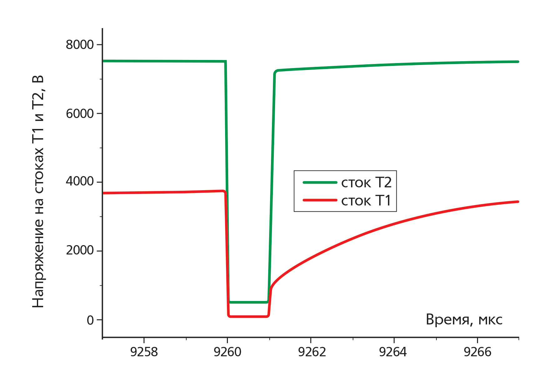 На рис. 4, 5 показано, что амплитуды ВВ-импульсов на ∆ ~ 0.5 кВ меньше, чем величины ЭДС на стоках Т1 и Т2 в состоянии OFF. Расхождение ∆ возникает из-за близости Uk к Umax, когда сопротивление канала может в несколько раз превышать значение Ron из документации на транзистор. Величину ∆ можно уменьшить, увеличивая значения R1 и R2, но это вызовет увеличение длительности переходов ON → OFF. Из сравнения экспериментальных осциллограмм (рис. 5) с данными моделирования (рис. 3) следует, что у IXTL2N450 длительность перехода ON → OFF примерно в 3 раза меньше, чем у его SPICE-модели, функционирующей в той же электрической схеме (рис. 1).