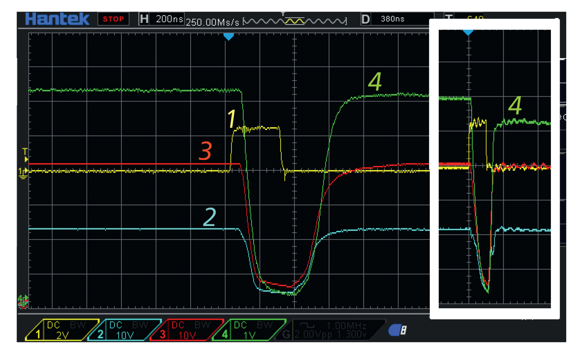 Рис. 5. Осциллограммы напряжений для 2×MOSFET: 1 – сигнал на входе драйвера FAN3122, который управляет затвором IXTL2N450 (T1), 2 – импульс на затворе Т1, 3 – ВВ-импульс на стоке Т1, ВИП подает ЭДС E1 = 4.0 кВ на нагрузочный резистор R1 = 220 Ом, регистрация высоковольтным пробником (100:1), 4 – ВВ-импульс на стоке Т2 (IXTH1N450HV), ВИП подает ЭДС E2 = 7.3 кВ на нагрузочный резистор R2 = 1.2 кОм, регистрация высоковольтным пробником (1000:1). Скорость развертки по горизонтали 200 нс/дел, масштаб по вертикали 1 кВ/дел.