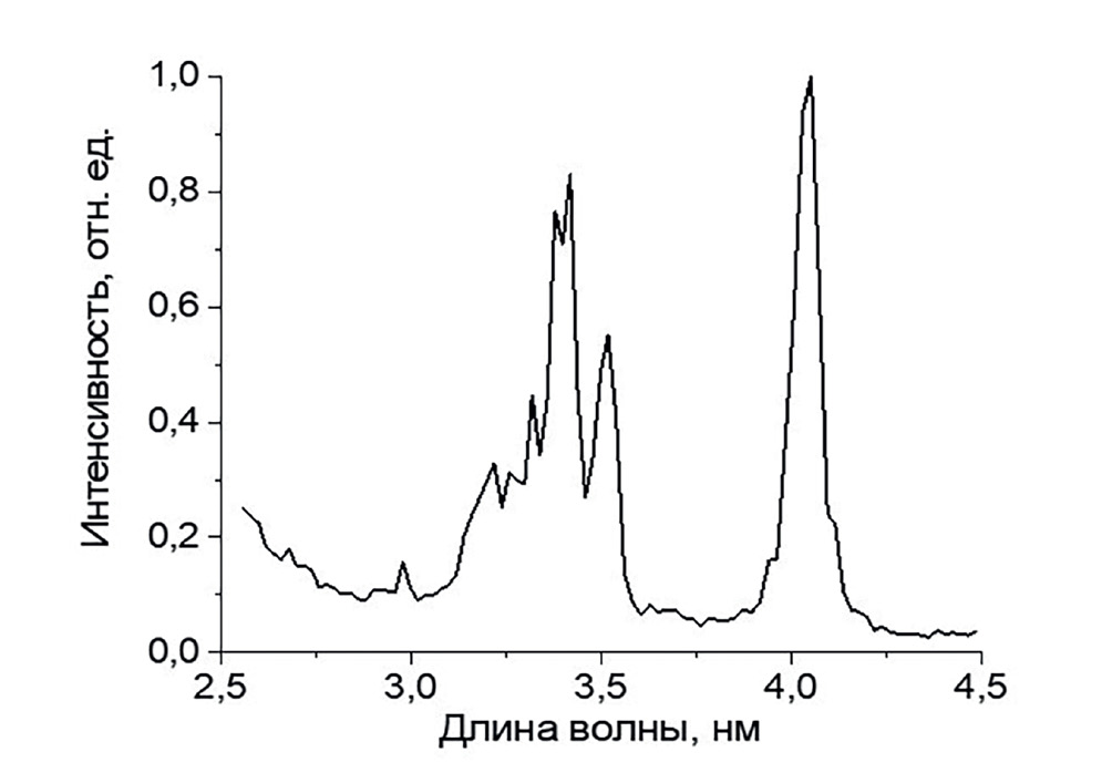 Рис. 7. Эмиссионный спектр изопропилового спирта в спектральном диапазоне 2.5–4.5 нм, полученный на зеркальном спектрометре.