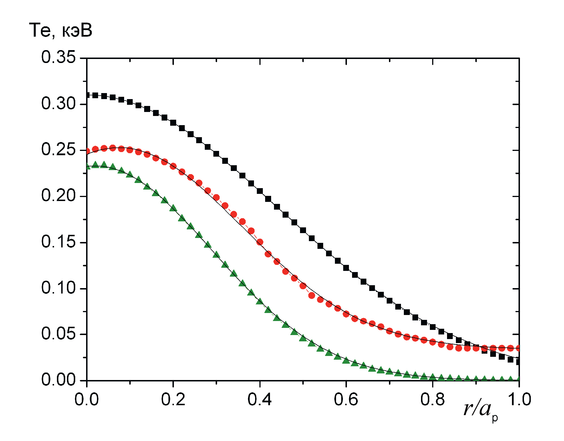 Рис. 6. Профиль электронной температуры, полученный в результате моделирования (черные квадраты), и расчетные профили радиационной температуры ЭЦ-излучения, принимаемого со стороны сильного (зеленые треугольники) и слабого (красные кружки) магнитных полей.