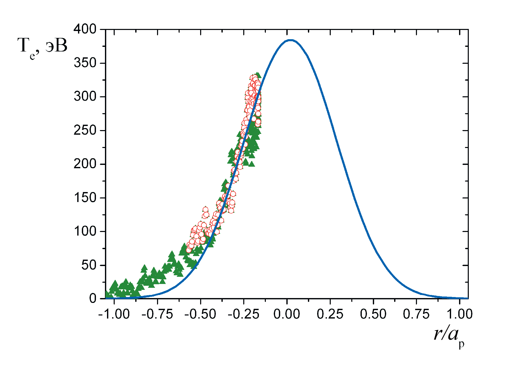 Рис. 7. Профиль радиационной температуры на частоте 78 ГГц в импульсе № 64118 в режиме омического нагрева. Полые красные кружки соответствуют первой половине импульса (45–55 мс), когда магнитное поле возрастает, а зеленые треугольники – второй половине импульса (55–75 мс), когда магнитное поле уменьшается. Сплошная синяя линия показывает профиль радиационной температуры, полученный в результате моделирования.