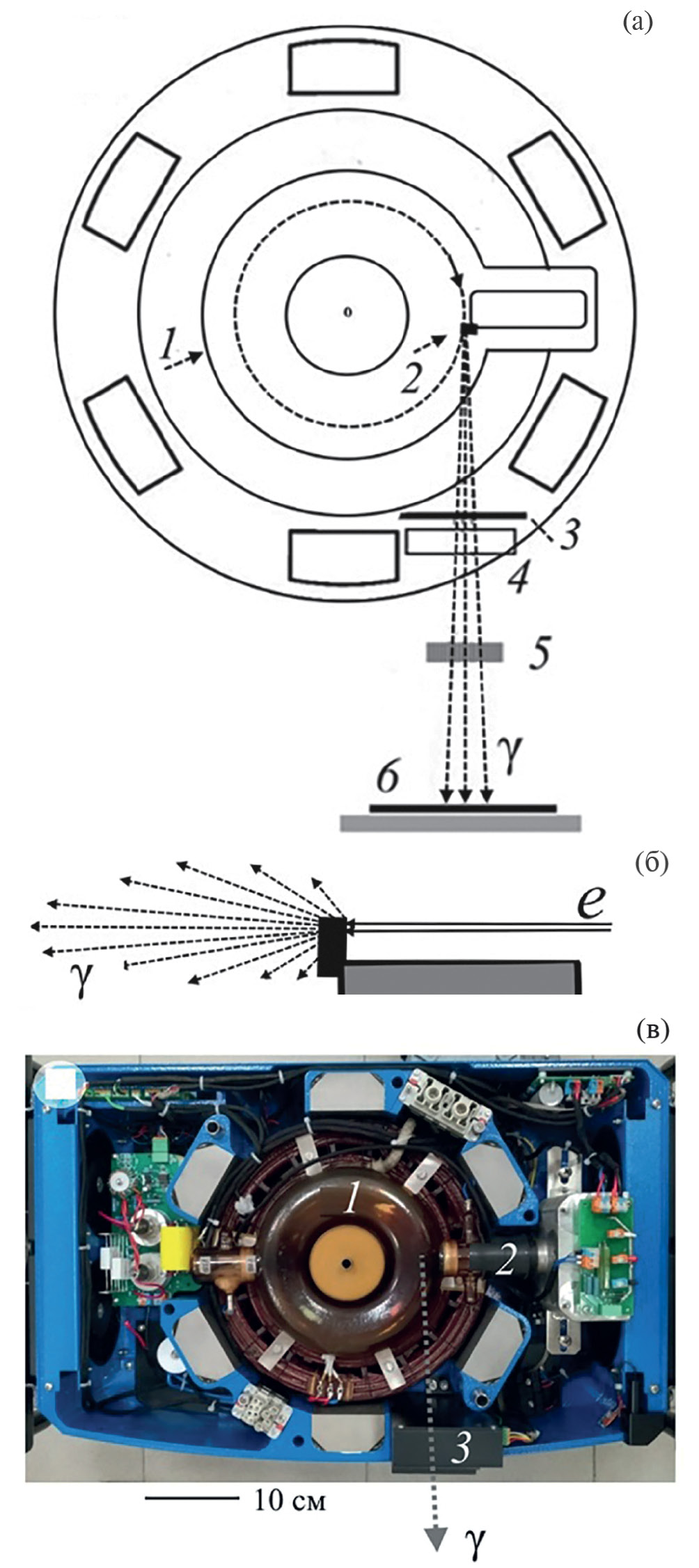 Схема экспериментальной установки показана на рис. 1а. Специальная система увеличения радиуса орбиты электронов после их ускорения в камере 1 усовершенствованного бетатрона SEA-7 обеспечивала сброс циркулирующего электронного пучка на молибденовую мишень 2 толщиной 0.6 мм, установленную на инжекторе электронов. Схема генерации тормозного излучения ускоренными электронами в мишени на инжекторе электронов приведена на рис. 1б. Фотография вскрытого бетатрона показана на рис. 1в.