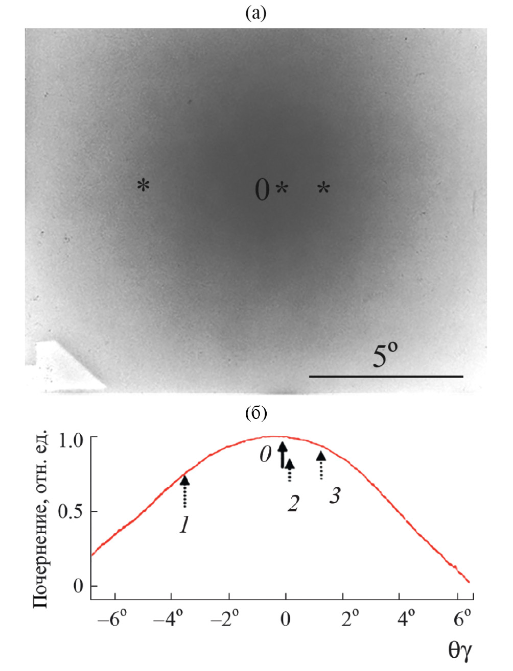 Рис. 2. а) Фотография пучка тормозного излучения, генерируемого электронами с энергией 7 МэВ бетатрона SEA-7. б) Профиль плотности почернения вдоль горизонтальной линии, проходящей через центр пятна почернения (символы “0” на фотографии и сплошная стрелка “0” (θγ = 0) на денситограмме. Символы “*” на фотографии пучка излучения и стрелки 1–3 на денситограмме показывают положения 10-й пары проволок стандарта при проведении измерений.