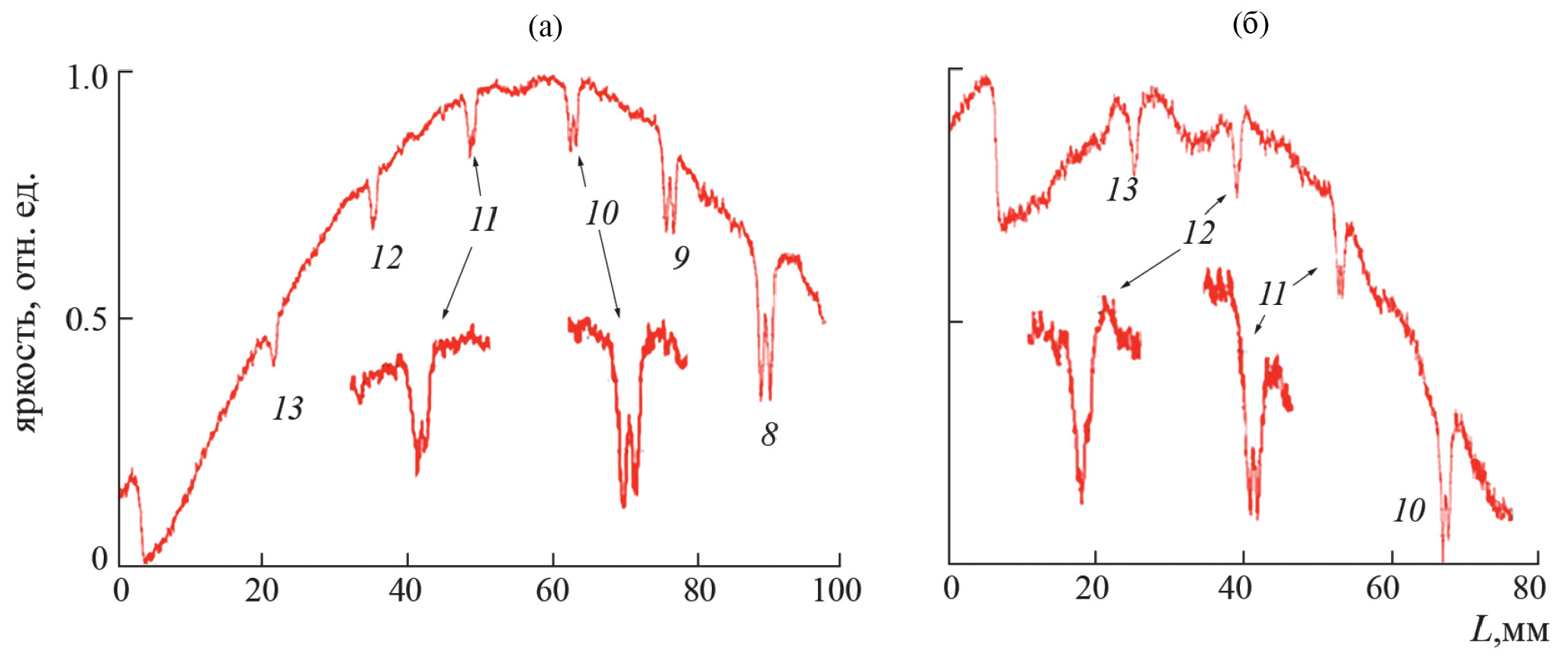 На рис. 4 приведены денситограммы изображений эталона Duplex IQI, когда он был перемещен в конусе излучения от первоначального положения так, что 10-я пара проволок 10 располагалась практически в центре (θγ = 0.2°, рис. 2) пучка излучения (рис. 4а) и под углом 1.4° (θγ = 1.4°, рис. 2) к оси пучка излучения (рис. 4б).