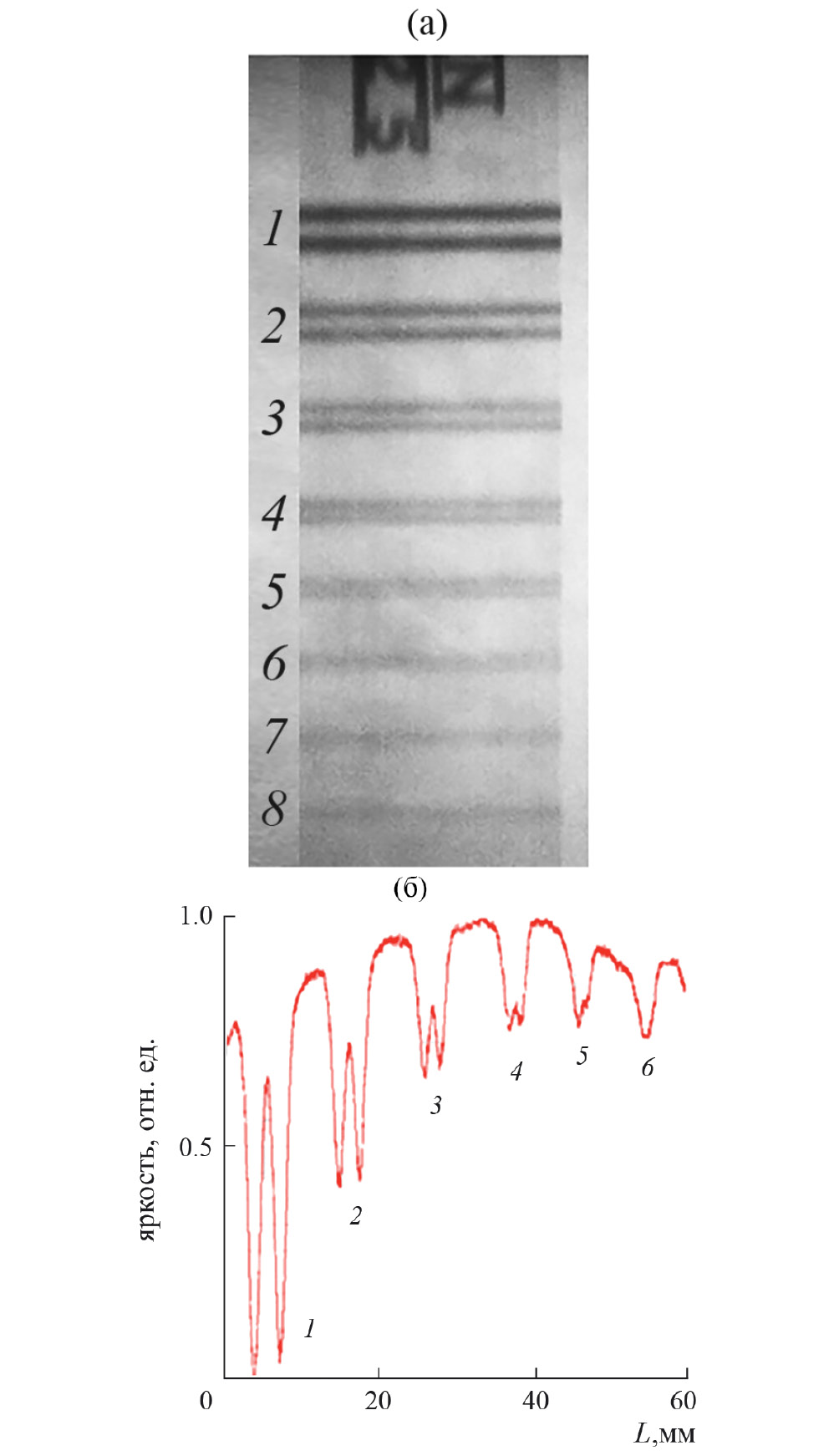 Рис. 5. а) Увеличенное (К = 2.4) изображение части стандарта Duplex IQI с 1-й–8-й парами проволок (1–8), установленного вертикально в пучке тормозного излучения. б) Денситограмма, показывающая разрешения 1-й–6-й пар проволок (1–6). Денситограмма измерена вдоль вертикальной линии, которая перпендикулярна изображениям пар.