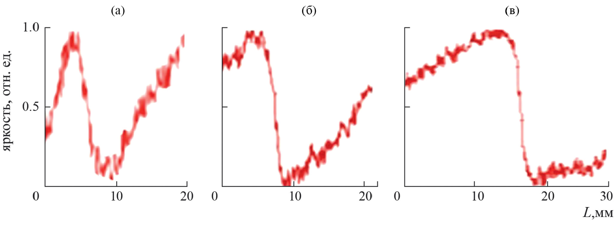 На рис. 6 приведены денситограммы изображений края пластикового корпуса эталона Duplex IQI толщиной tp = 4 мм, когда он располагался в конусе излучения под углами θγ = –3.5° (а), –2.2° (б), –1° (в) к оси пучка излучения. Изображения края корпуса для фотометрирования были взяты из изображений эталона, полученных при его перемещениях относительно центра пучка излучения.