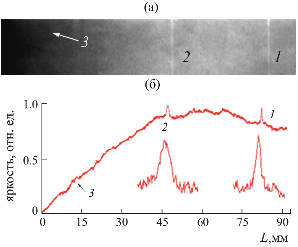 Рис. 7. a) Изображение части стальной сборки с зазорами 1, 2 и 3 между ее частями шириной 10 мкм. б) Денситограмма, показывающая профили (1 – 3) яркости изображений зазоров (1 – 3) в сборке, установленной в пучке излучения так, что зазоры 1, 2, 3 расположены под углами θγ = 0.74°, – 0.74°, – 2.22° соответственно к оси пучка излучения (рис. 2). Денситограмма была измерена вдоль горизонтальной линии, которая перпендикулярна изображениям зазоров. Также приведены увеличенные профили яркости изображений зазоров 1 и 2.