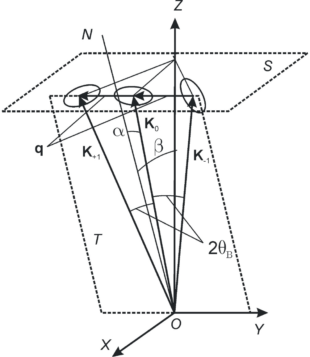 На рис. 1 приведена векторная диаграмма акустооптической дифракции в два симметричных порядка, происходящей в одноосном кристалле. На рисунке представлен трехмерный вид акустооптического взаимодействия в кристаллографической системе координат (X, Y, Z), где OZ – оптическая ось кристалла. Акустическая волна с волновым вектором q распространяется вдоль направления OY; K0, K+1 и K-1 – волновые векторы соответственно нулевого, плюс первого и минус первого дифракционных порядков. Все векторы лежат в одной плоскости T, называемой плоскостью дифракции. Плоскость T наклонена к оптической оси OZ на угол β. На рисунке угол β представлен как угол между OZ и прямой N, лежащей в плоскости T. Прямая N ортогональна направлению OY. Вектор K0 наклонен в плоскости T на угол α к прямой N. Таким образом, ориентация K0 определяется углами α и β. Ориентации дифрагировавших лучей K+1 и K-1 жестко привязаны к ориентации луча K0: во-первых, все лучи лежат в одной плоскости T, а во-вторых – угол между K0 и K+1, а также угол между K0 и K-1 равен двойному углу Брэгга в силу выполнения брэгговского синхронизма [1–3]. Угол Брэгга равен θB = q/2K, где q и K – величины волновых векторов звука и света.