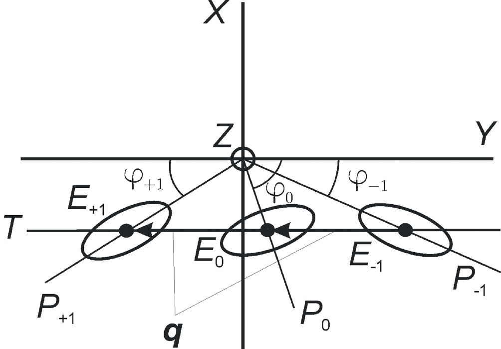 На рис. 1 поляризации лучей изображены в виде эллипсов. Для анализа поляризаций рассмотрим плоскость S на рис. 1, параллельную плоскости OXY и проходящую через концы волновых векторов K0, K+1 и K-1. На рис. 2 приведен вид плоскости S. Здесь E0, E+1 и E-1 – эллипсы поляризаций соответственно волн K0, K+1 и K-1. Полуоси эллипсов всегда ориентируются вдоль главных плоскостей поляризаций P0, P+1 и P-1. Как известно [29], плоскостью поляризации волнового вектора K называется плоскость, проходящая через вектор K и оптическую ось OZ кристалла. Для ТеО2 поляризация луча K0 соответствует поляризации “обыкновенного” луча (большая полуось эллипса поляризации направлена ортогонально главной плоскости P0). Лучи K+1 и K-1 – “необыкновенные”, большие полуоси поляризаций лежат соответственно в главных плоскостях P+1 и P-1. Плоскости поляризаций P0, P+1 и P-1 ориентированы под углами φ0, φ+1 и φ-1 к направлению OY. В экспериментах предполагалось, что поляризатор будет устанавливаться либо вдоль направления OY, совпадающего с направлением распространения звука, либо вдоль направления OX, ортогонального звуковой волне. Нетрудно показать, что амплитуда поля вдоль направления OY, получаемая после прохождения эллиптически поляризованного излучения через поляризатор, ориентированный своим направлением максимального пропускания вдоль направления OY (Y-поляризация), определяется формулой