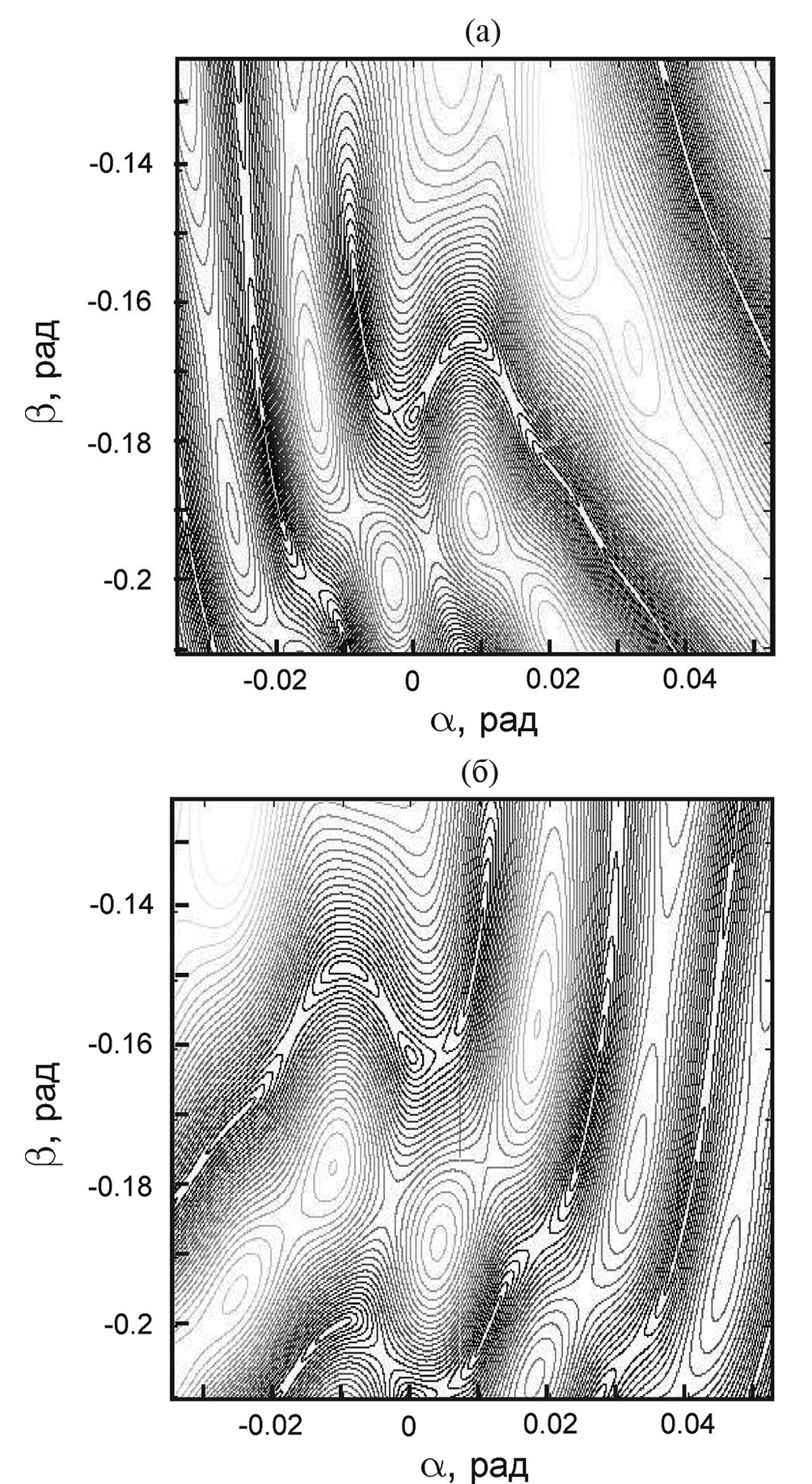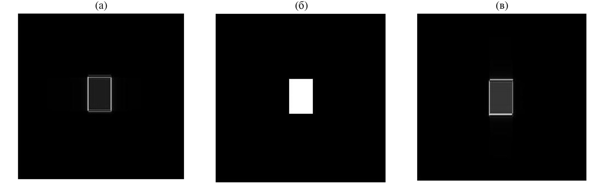 Наши эксперименты выполнялись с исполь- зованием He–Ne-лазера, генерирующего на дли- не волны света λ = 0.63 мкм. В качестве материала акустооптической ячейки использовался парателлурит (ТеО2), параметры которого были следующими [30, 31]: n0 = 2.26, ne = 2.41, G33 = 2.62∙10-5, M2 = 1200∙10-18 с3/г, скорость звука V = 0.617∙105 см/с. Скорость звука необходима для вычисления волнового вектора звука К = 2πf/V, где f – частота звука. Длина акустооптического взаимодействия L и высота акустического столба R соответствовали параметрам изготовленной акустооптической ячейки и были равны 0.2 см. Акустическая мощность бралась равной = 0.075 Вт. Частоты звука были выбраны 34 МГц для формирования передаточной функции в X-поляризации и 423 МГц для Y-поляризации. Решение системы (4) приведено в работе [20]. Там же получены зависимости E0, E+1 и E-1 от мощности звука и расстроек фазового синхронизма η1 и η2. Отметим, что передаточные функции H0, H+1 и H-1, являющиеся базовыми характеристиками пространственного фильтра, совпадают с распределениями E0, E+1 и E-1 при Einc = 1. В наших расчетах они вычислялись в зависимости от углов α и β. Передаточные функции в общем случае представляют собой набор интерференционных линий с изгибами, обрывами, изменяющимся утолщением линий и т.п. На рис. 3 приведены модули передаточных функций минус первого и плюс первого дифракционных порядков │H+1│и │H-1│ (рис. 3 а, б), построенные для частот 34 и 42 МГц соответственно в X- и Y-поляризациях, которые позволяют выделять контур изображения. Угловой размер распределений равен примерно 5°×5°. На рисунке углы приведены в радианах. Видно, что передаточные функции представляют собой набор интерференционных сильно изогнутых линий. На рис. 4 приведены результаты фурье-обработки изображения в виде прямоугольника: а – результат с использованием фильтра на рис. 3а, б – исходное изображение, в – с использованием фильтра рис. 3б. Видно, что изображения 4а и 4в являются хорошо выраженными контурами рис. 4б. Другими словами, полученные передаточные функции позволяют выделять двумерный контур изображения на разных частотах.