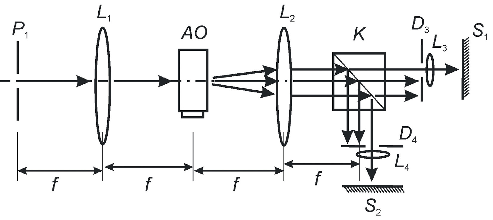 Рис. 5. Оптическая схема экспериментальной установки: P1 – плоскость входного изображения; L1, L2 – линзы с фокусным расстоянием f, выполняющие фурье-преобразования; AO – акустооптический фильтр пространственных частот; K – поляризационный кубик; L3, L4 – короткофокусные линзы, увеличивающие выходные изображения; D3, D4 – диафрагмы; S1, S2 – экраны для наблюдения выходных изображений.