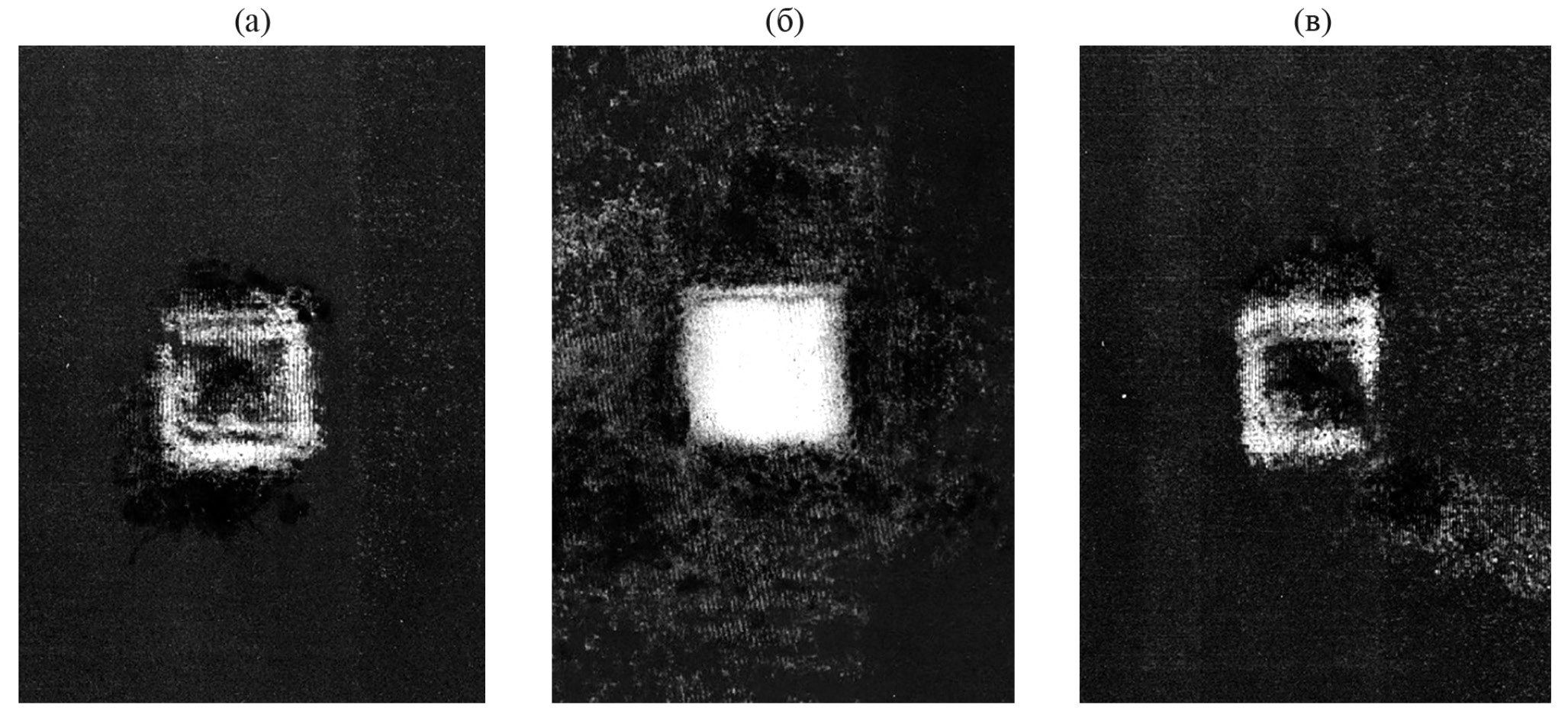 Рис. 4. Изображение после фурье-обработки в плюс первом дифракционном порядке (а), исходное изображение (б), изображение после фурье-обработки в минус первом дифракционном порядке (в). Изображение а получено с помощью передаточной функции рис. 3а, изображение в – с помощью функции рис. 3б.