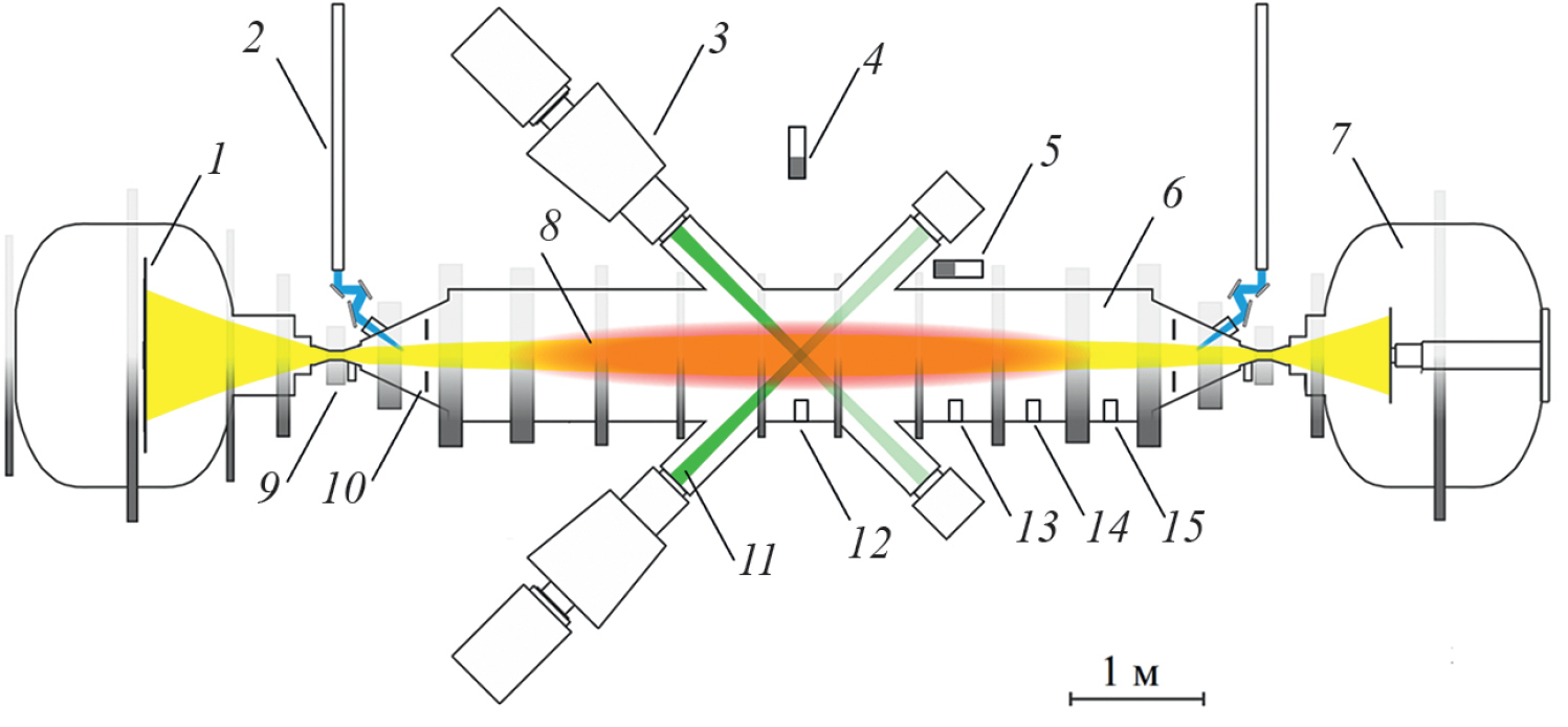 Рис. 1. Установка газодинамическая ловушка: 1 – приемник плазмы, 2 – волноводы системы СВЧ-нагрева плазмы, 3 – инжекторы нейтральных атомов, 4 – спектрометр нейтронов и гамма-квантов на основе стильбена, 5 – детектор на основе сцинтиллятора и ФЭУ, 6 – центральная ячейка ГДЛ, 7 – расширительный бак, 8 – быстрые ионы, 9 – катушка магнитной пробки, 10 – лимитер, 11 – пучки атомов дейтерия, 1215 – детекторы термоядерных протонов на основе диодов.
