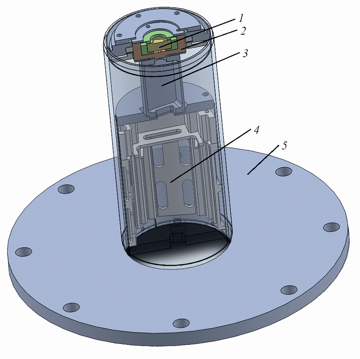 Рис. 3. Трехмерная модель детекторного модуля: 1 – диод с площадью чувствительной поверхности 1 см2, 2 – деталь, которая разделяет вакуум и атмосферу, 3 – место расположения предусилителя, 4 – кожух, в который устанавливается блок аккумуляторов для питания предусилителя (управляется по оптическому каналу), 5 – стандартный вакуумный фланец ГДЛ.