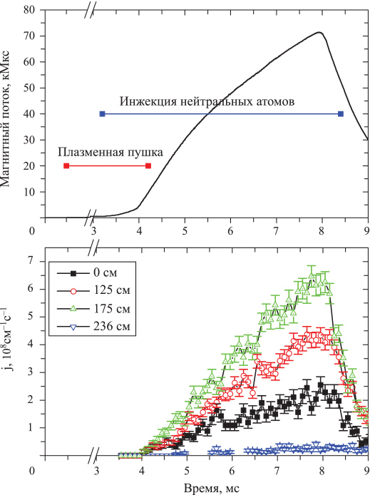 Построение временной эволюции выхода реакции синтеза J (J – количество нейтронов (или протонов) продуктов реакций синтеза в единицу времени, возникающее на единице длины плазменного столба установки) на ГДЛ (рис. 6) проводится путем суммирования частиц по интервалам, которые определяют временное разрешение при условии достаточно большого количества частиц. При максимальной скорости счета 2.5 ∙ 106 событий в секунду (вероятность наложения событий 10%) временное разрешение составляет 100 мкс. Дополнительно на рис. 6 приведены временная диаграмма работы систем создания и нагрева плазмы и сигнал с диамагнитной петли, расположенной вблизи точки остановки быстрых частиц. Этот сигнал равен вытесненному плазмой магнитному потоку и пропорционален энергии, запасенной в быстрых ионах плазмы. Приведенный сигнал характерен для плазменных экспериментов на ГДЛ без магнитогидродинамических и микронеустойчивостей. Отметим, что под временным разрешением имеются в виду характерные времена плазменных процессов, которые могут быть исследованы с помощью настоящей диагностики. Поэтому временное разрешение фактически соответствует времени набора статистики, необходимому, чтобы измерить поток продуктов с необходимой точностью. Для экспериментов на ГДЛ обычно измеряются значения выхода термоядерной реакции из соответствующих областей плазмы с точностью 10%, что соответствует времени набора статистики 100 мкс.