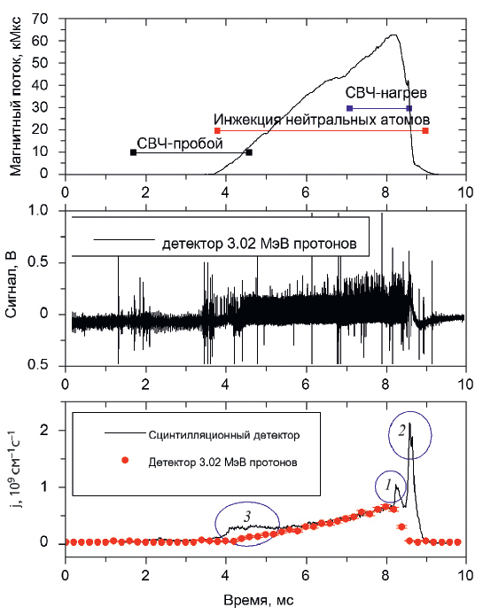Рис. 8. Временная диаграмма работы систем создания и нагрева плазмы (верхний график). Дополнительно приведен сигнал диамагнитной петли, расположенной вблизи точки остановки быстрых частиц. Сигнал детектора термоядерных протонов (средний график). Выход реакции синтеза на единицу длины установки, измеренный протонным детектором и сцинтилляционным детектором в эксперименте со вспышкой рентгеновского излучения (нижний график). Цифрами обозначены вспышки рентгеновского излучения при СВЧ-нагреве плазмы (1, 2) и СВЧ-пробое газа (3).