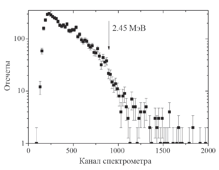 Рис. 12. Спектр комптоновских электронов, зарегистрированных в стильбеновом сцинтилляторе, в экспериментах по регистрации вспышек рентгеновского излучения на ГДЛ.