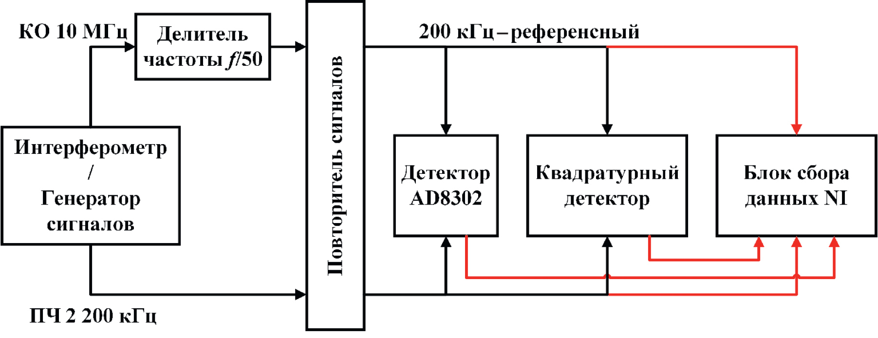 Информация о фазе сигнала ПЧ2 и величине ее сдвига, обусловленного прохождением через плазму, определялась одновременно тремя способами. Для этого была собрана фазоизмерительная система, включающая детекторы двух типов – квадратурный и AD8302, а также блок сбора данных на базе модулей National Instruments. Схема подачи сигналов на блоки этой системы приведена на рис. 3.