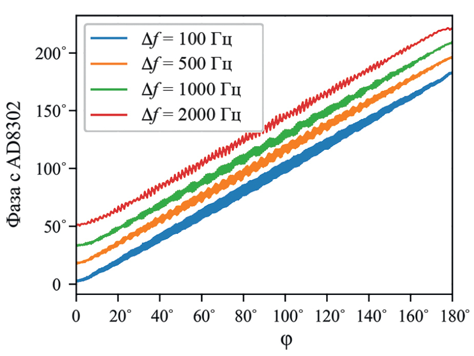 На рис. 9 приведены зависимости разности фаз, измеренной с помощью детектора AD8302, от реальной величины фазового сдвига сигналов для каждого из четырех значений частотной расстройки Δf = 100, 500, 1000, 2000 Гц. Полученные зависимости лежат на одной прямой. Для наглядности в реальных значениях приведен только график, соответствующий Δf = 100 Гц, остальные графики построены со смещением вдоль вертикальной оси. Величина смещения между соседними прямыми составляет Δj = 10°.