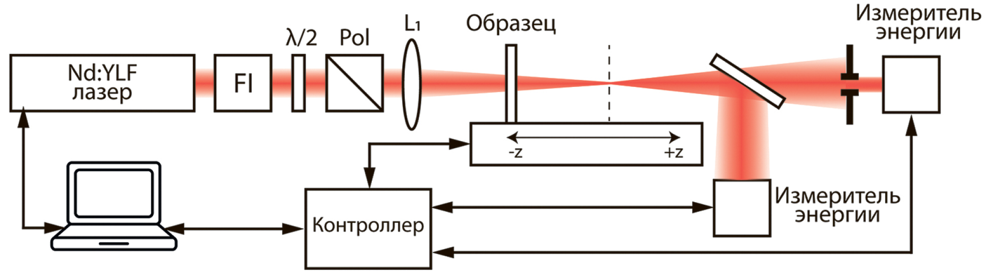 Схема Z-сканирования представлена на рис. 1. В качестве источника излучения использовался Nd:YLF-лазер (TECH 1053 Advanced, ООО “Лазер-экспорт”) с длиной волны 1.053 мкм и длительностью импульсов 5.3 нс на частоте следования импульсов 1 кГц. Максимальная энергия в импульсе лазера накачки составляла 1 мДж, показатель качества пучка M2 < 1.4.