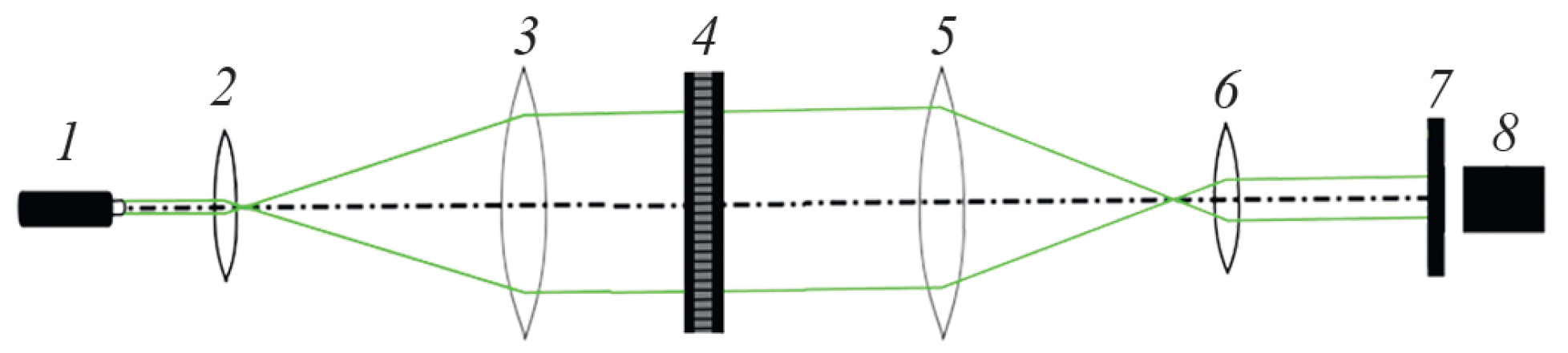 Рис. 1. Схема установки: 1 – лазер на длине волны 532 нм, 2, 3, 5, 6 – линзы телескопов, 4 – SLM, 7 – экран, 8 – телекамера.