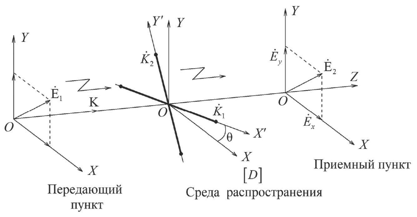 Использование векторных свойств электромагнитных волн, излучаемых передатчиком, а также принимаемых результирующих векторных сигналов, прошедших среду распространения и поляризованных определенных образом, требует необходимости их рассмотрения в определенных поляризационных базисах и в различных системах координат, связанных с разнесенными передающим и приемным пунктами. При этом выбор опорной системы координат, связанной с передающим и приемным пунктами, и выбор собственной системы координат, связанной со средой распространения, а также выбор метода обработки принятых векторных сигналов определяются как особенностями решаемой технической задачи, так и удобством анализа с точки зрения физической интерпретации полученных результатов.