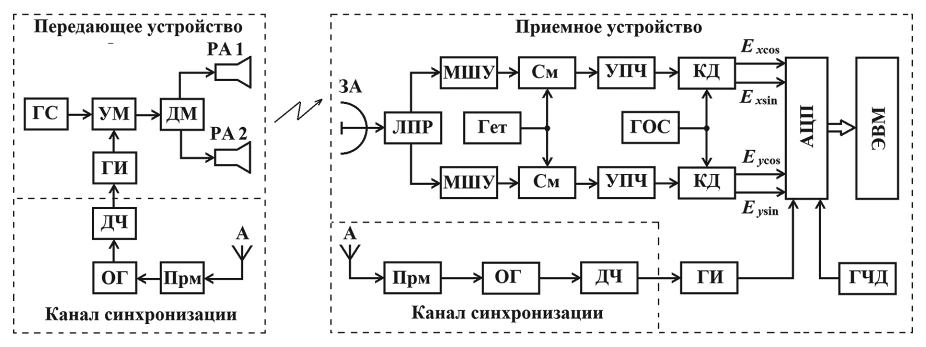 Рис. 2. Структурная схема экспериментальной установки радиофизического комплекса: ГС – генератор сигналов СВЧ на частоте 9.3 ГГц, УМ – усилитель мощности, ДМ – делитель мощности, РА1 – рупорная антенна горизонтальной поляризации, РА2 – рупорная антенна вертикальной поляризации, А – антенна для приема GPS-сигналов, Прм – приемник GPS-сигналов, ОГ – опорный генератор FS725, ДЧ – делитель частоты, ГИ – генератор прямоугольных импульсов Г5–63, ЗА – зеркальная антенна трехсантиметрового диапазона, ЛПР – линейный поляризационный разделитель, МШУ – малошумящий усилитель, См – смеситель, Гет – гетеродин типа Г4–83 на частоте 8.85 ГГц, УПЧ – усилитель промежуточной частоты, КД – квадратурный демодулятор, ГОС – генератор опорного сигнала на частоте 450 МГц, АЦП – аналого-цифровой преобразователь, ЭВМ – электронно-вычислительная машина, ГЧД – генератор частоты дискретизации Г4–158 на частоте 90 МГц, Excos, Exsin, Eycos и Eуsin – квадратуры сигналов ортогональных составляющих .Ex и .Ey.